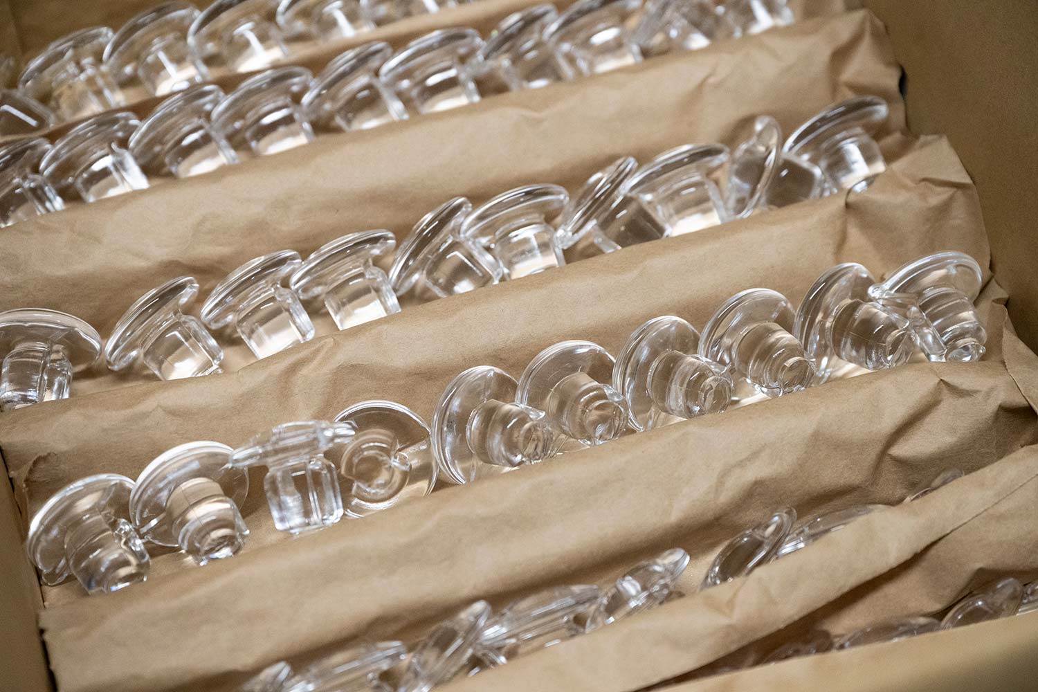 大正6年(1917)に江東区で創業し、戦後現在地で再開したガラスメーカーで東京都指定伝統工芸品「江戸硝子」の窯元。本社2階の工場には墨田区唯一の溶解炉が鎮座し、約1500℃でガラスを溶かしている。20人以上の職人が丹精込めて作るのは、江戸前すり口醤油注ぎをはじめ、モダンなFUTATSUKIシリーズなど多彩にある。在庫があれば直売可。