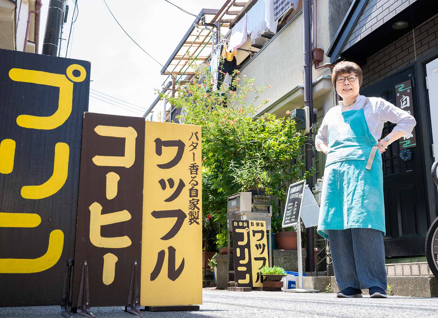 地元っ子の吉井ひとみさんが実家の一部を改装して2021年にカフェを開店。路地に並ぶ達筆な看板はなんと手描きで「江戸文字を28年習ってます!」。気になる店名は、小学校で観に行った日本初のカラー長編アニメ映画のタイトルだとか。しっかり固めに蒸したプリン、バターが香る焼きたてのワッフルが自慢。平日は9歳下の弟さんが営業することも。