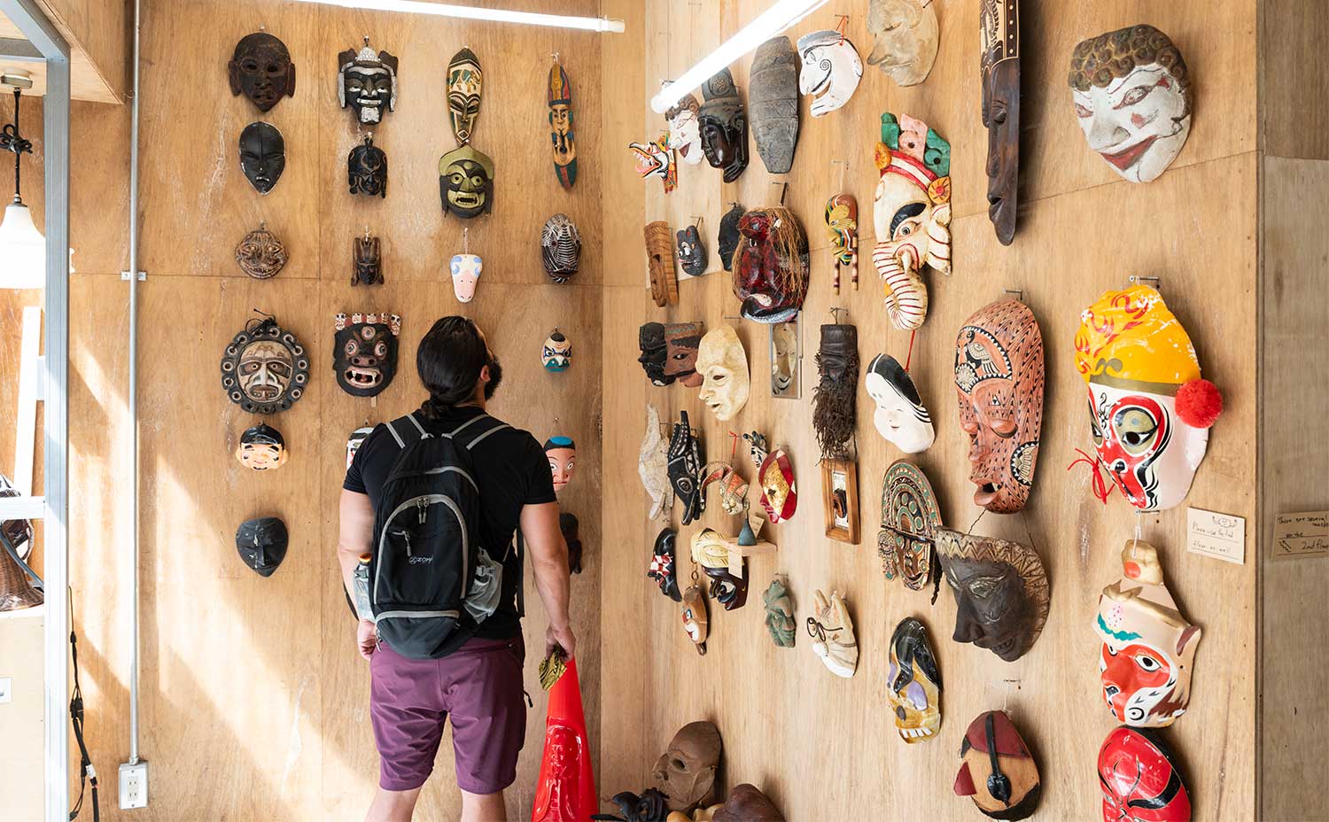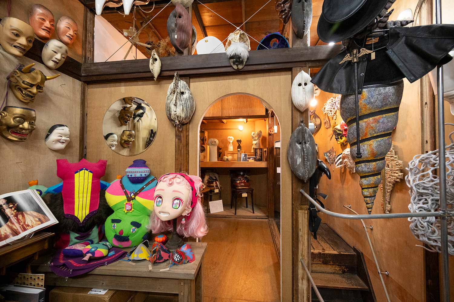 「仮面作家の作品を売りたい」とオーナーがネット販売を経て2016年に開店。文字通り個性豊かな仮面でいっぱい。「扱っている作家さんは約20名。でも最近は仮面の無料引き取りを始めて国内外のさまざまな仮面が、置き場に困るほど集まってます」と店長の相沢僚一さん。手にするのは画像と3Dスキャンのデータで作った超リアルなオーナーの仮面だ。