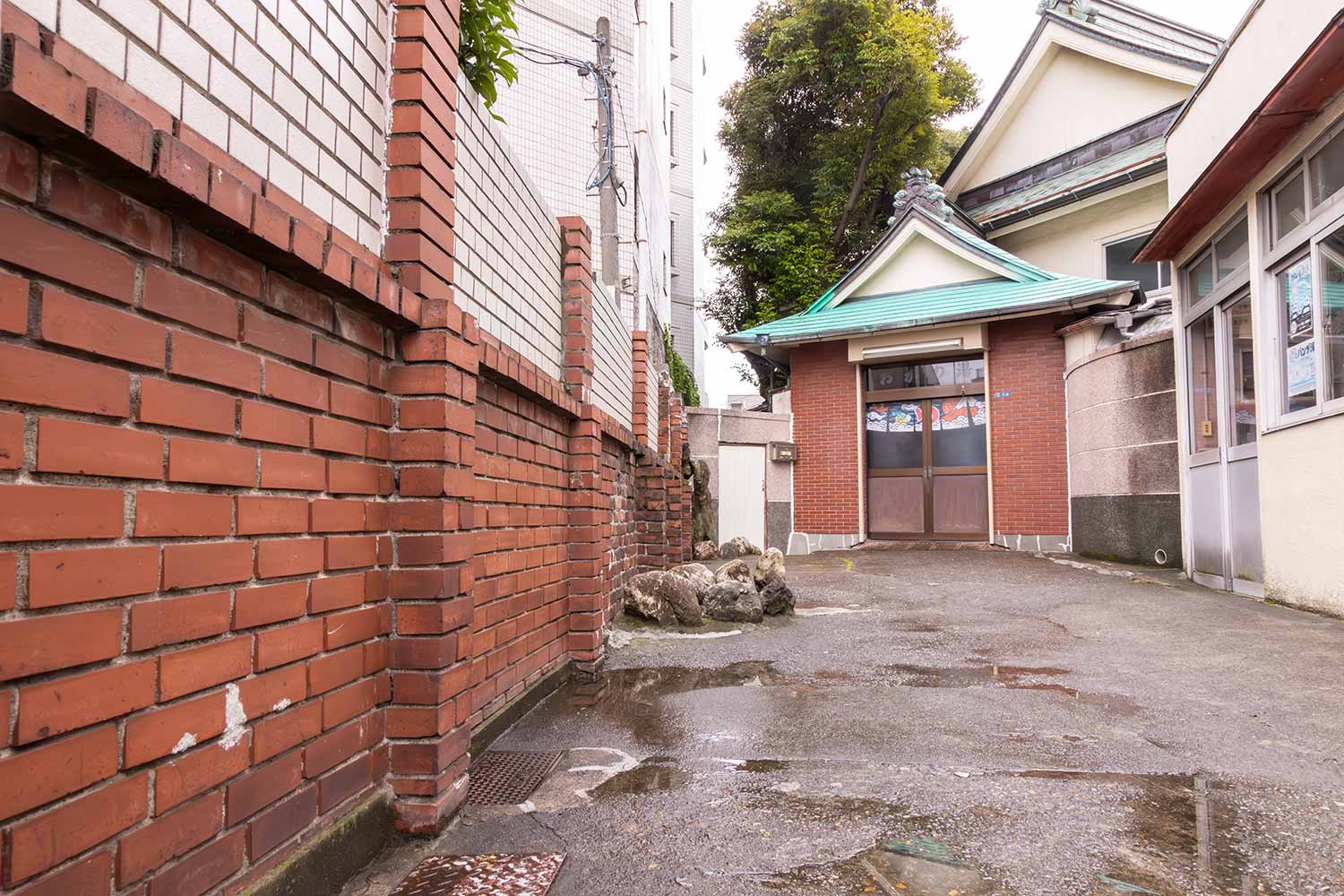 昔ながらの風情のおかめ湯。鳥井陶器製造所産のレンガ塀は付近唯一のレンガの名残。