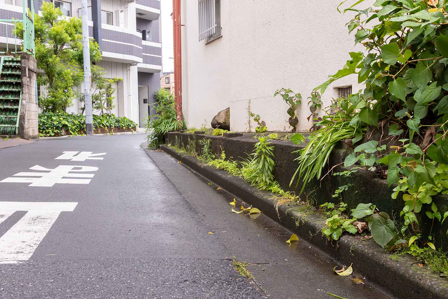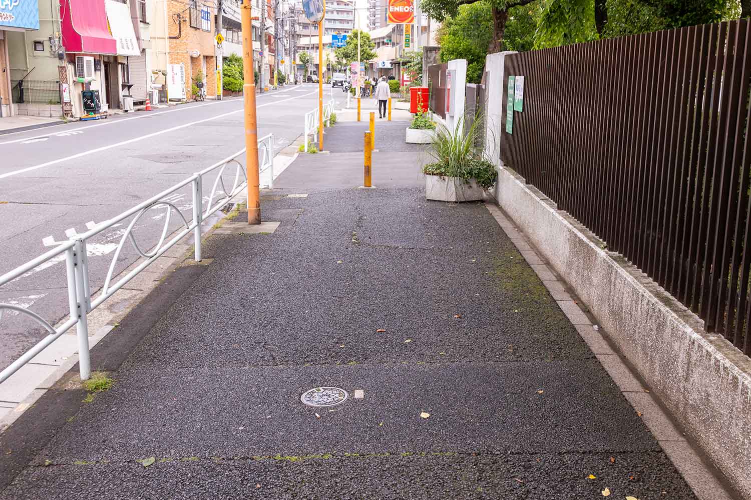 車道に比べ不自然に太い歩道は、ここが川だった証拠。途中には重いクルマが乗り入れないよう「車止め」も置かれ暗渠を守っている。