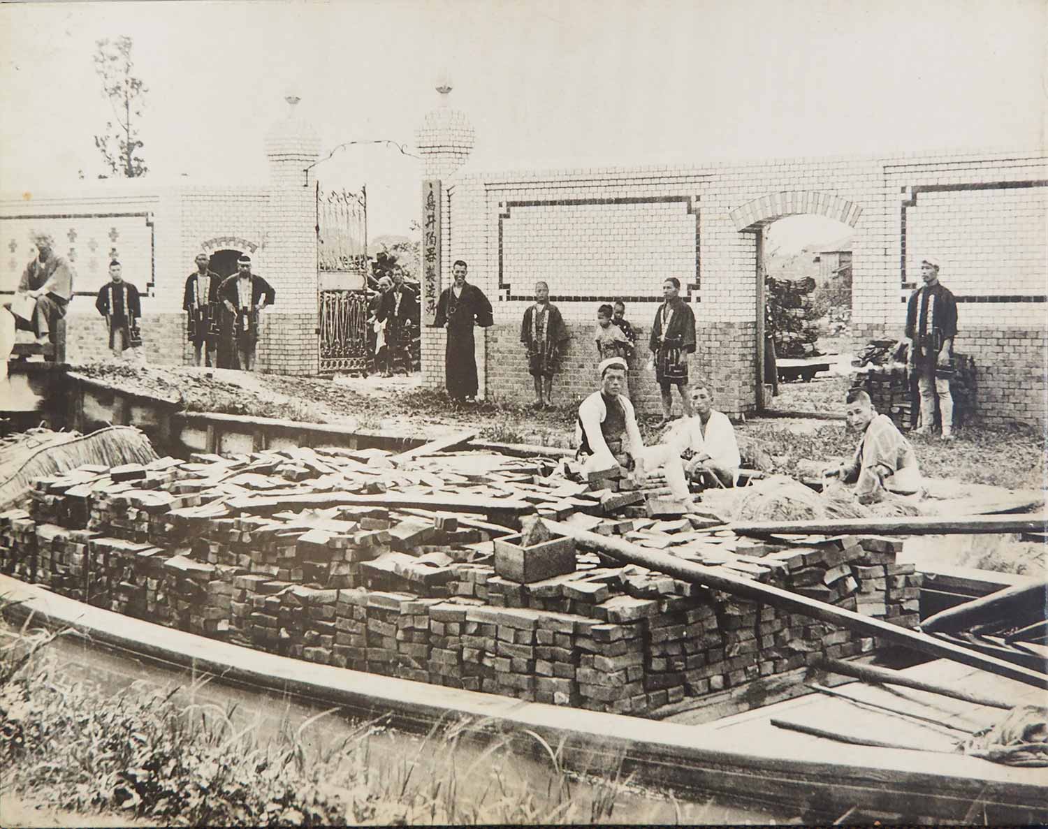 明治時代、ここにはモダンなレンガの壁に囲まれた工場があった。曳舟川に浮かぶ舟に沢山の人手で大量のレンガを載せている写真も残る(写真提供=鳥井冨美子)。