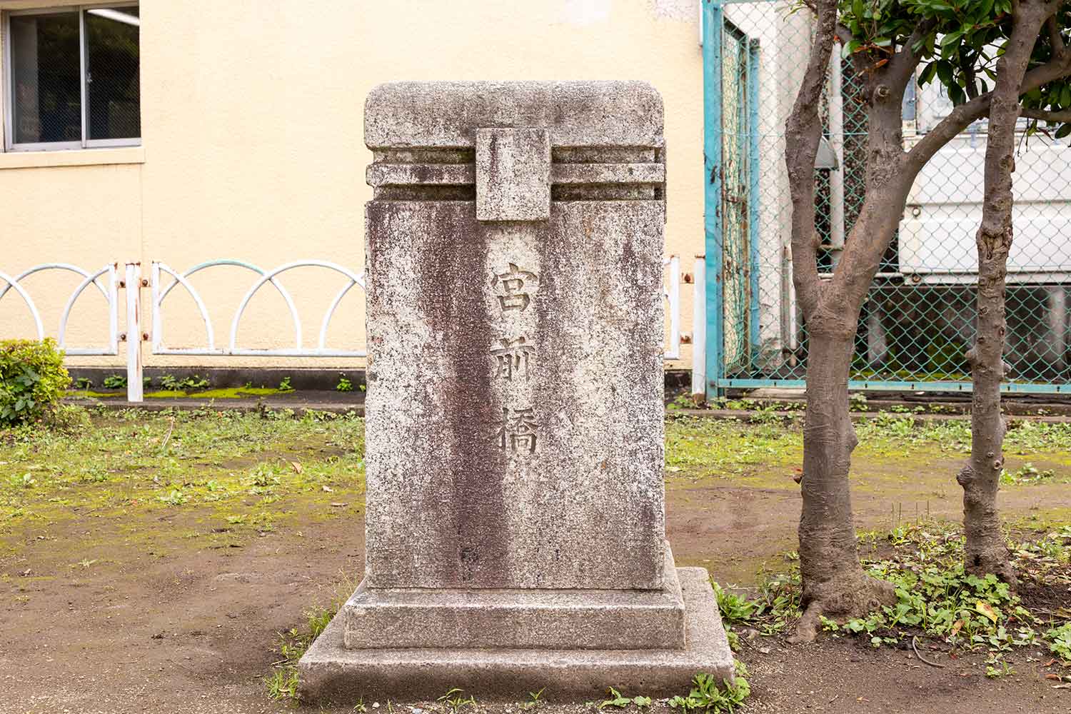 交差点の名前に「橋」とあるのは、ここが川で、橋がかかっていた場所だから。橋の本体は近所の小学校内に保管されている。