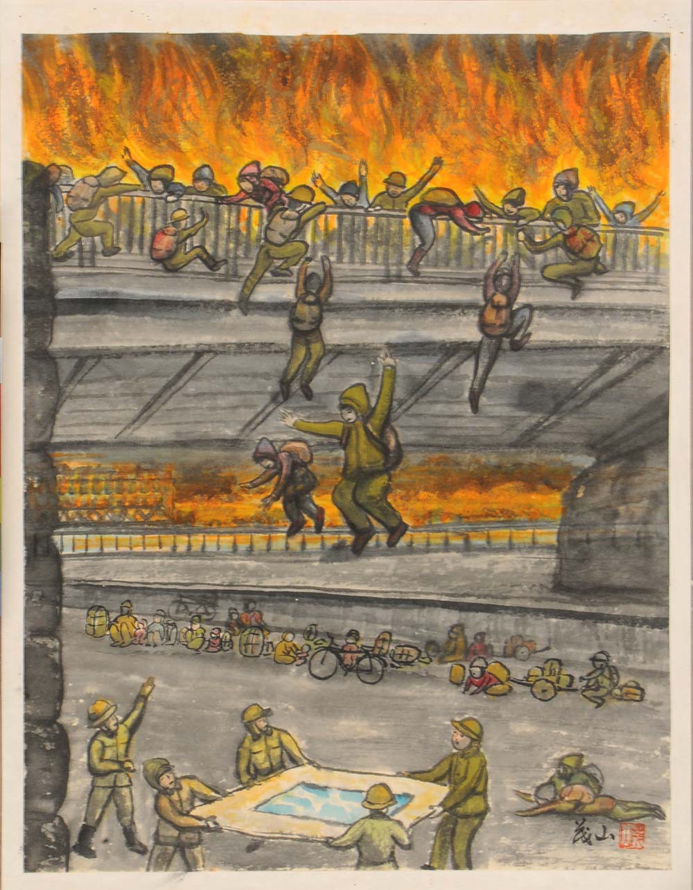 空襲体験画はその1プロジェクト。東京の空襲の被災実態を表現した絵画収集である。「2004年の企画展に向け、2003年3月から広く提供を呼びかけました。『自らの空襲体験でもっとも印象に残る光景をご自身で描いてください』とお願いし、その1年で200点以上、その後も継続して現在は123人から計約300点収集しています。作者は空襲当時で下は4~5歳、上は20代後半。そのうち墨田区内が描かれた絵は3分の1ほどでしょうか」と、学芸員の石橋星志さん。