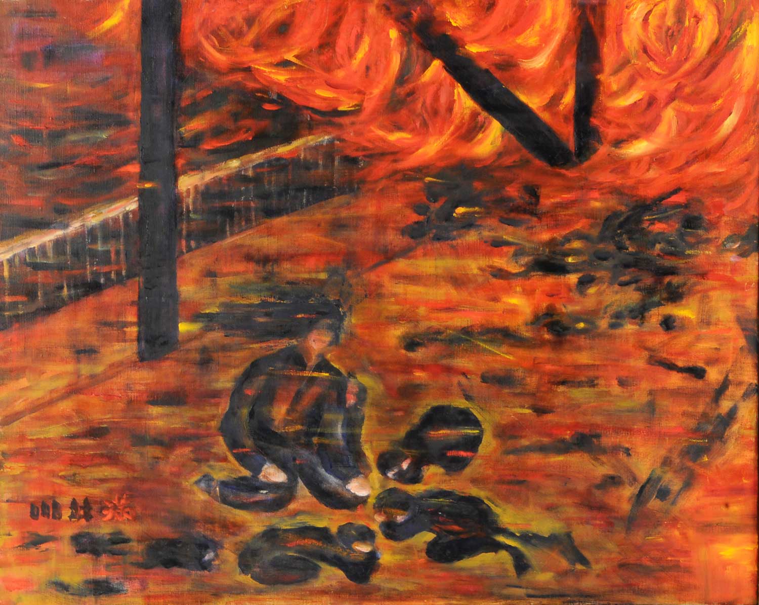 例えば「昔、街が焼かれた~虫けらのようになって~」の絵は、4人の姿が見える。うずくまる作者と兄弟、座る母だ。だが左端の黒い影、ここに証言しがたい記憶が反映されているという。それは作者が隣で見た、背中から一筋の煙が上がっている小さな子供の姿。絵にするまで誰にも話せず、けれど忘れられない記憶。自分だけが分かるように小さい影で残したそうだ。