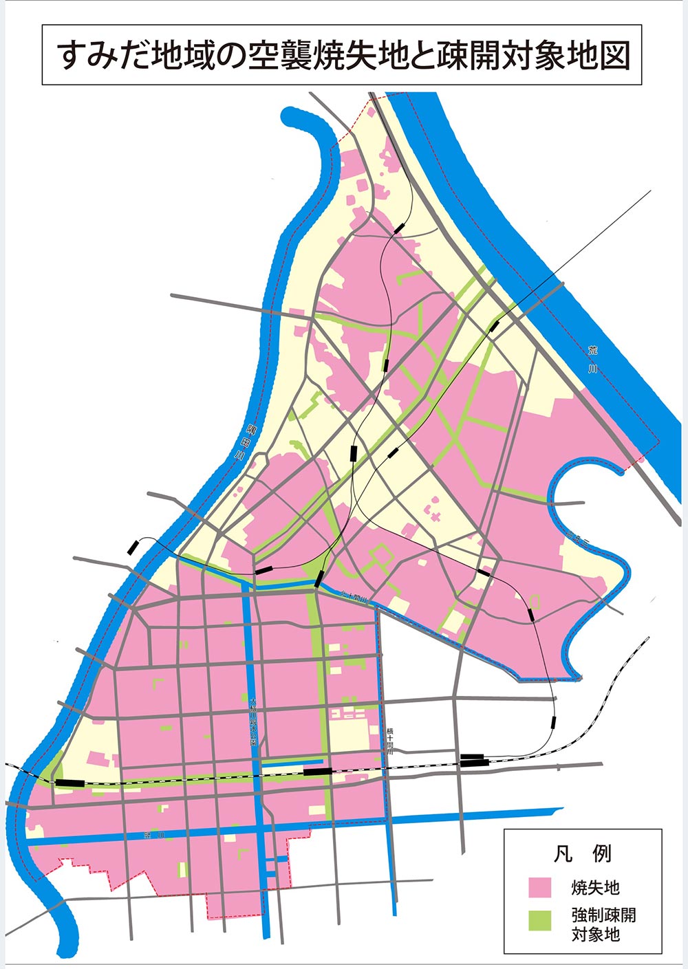 昭和16年(1941)12月に始まったアジア太平洋戦争。アメリカ軍が初めて東京を空襲したのは昭和17年(1942)4月18日、B25による奇襲攻撃だ。昭和19年(1944)11月24日にはB29が航空機関連工場を第一目標に爆撃。これを機に東京は恒常的に空襲にさらされる。昭和20年(1945)3月10日の東京大空襲ではついに市街地を焼夷弾で焼き払うことが目的に。4、5月にも空襲を受けた墨田区は区全体で約半分、本所地域は95%が焼失。終戦までに東京の空襲は約100回にも及んだ。