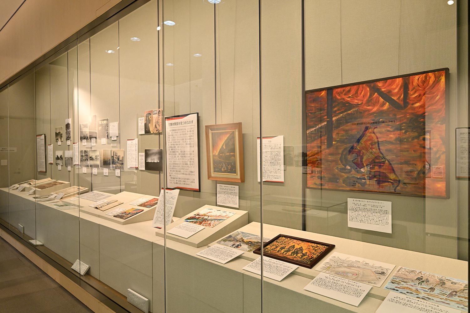 2025年9月21日まで、3階展示室で開かれる、東京大空襲80年展の第2期展。4つのテーマを設け、花王をはじめ墨田区ゆかりの企業の被災資料紹介、東京の主な新聞社やニュース映画製作会社に設けられた「東部軍国防写真隊」の詳細と被害写真の解説、空襲体験画の構図別考察、区内の戦争遺跡と慰霊供養の紹介で展開する。