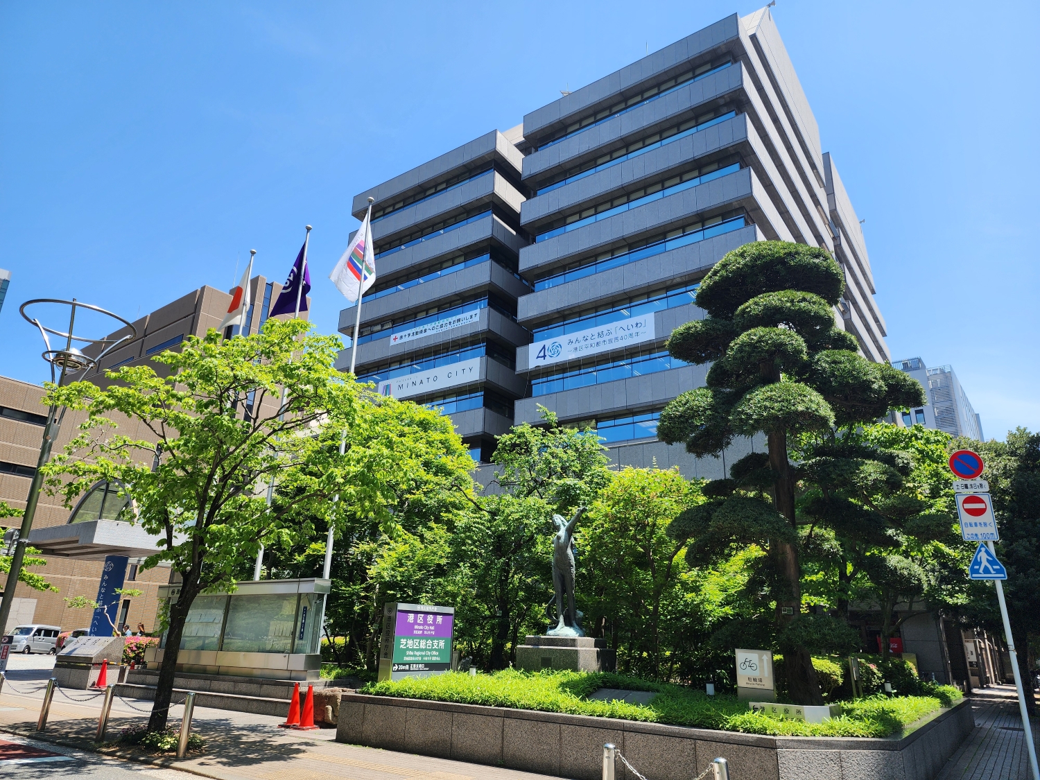 大門をくぐり、増上寺に着く手前を右に曲がったところに港区役所がある。ビルに囲まれた路地を抜けると、正面は芝公園に面していて緑豊か。