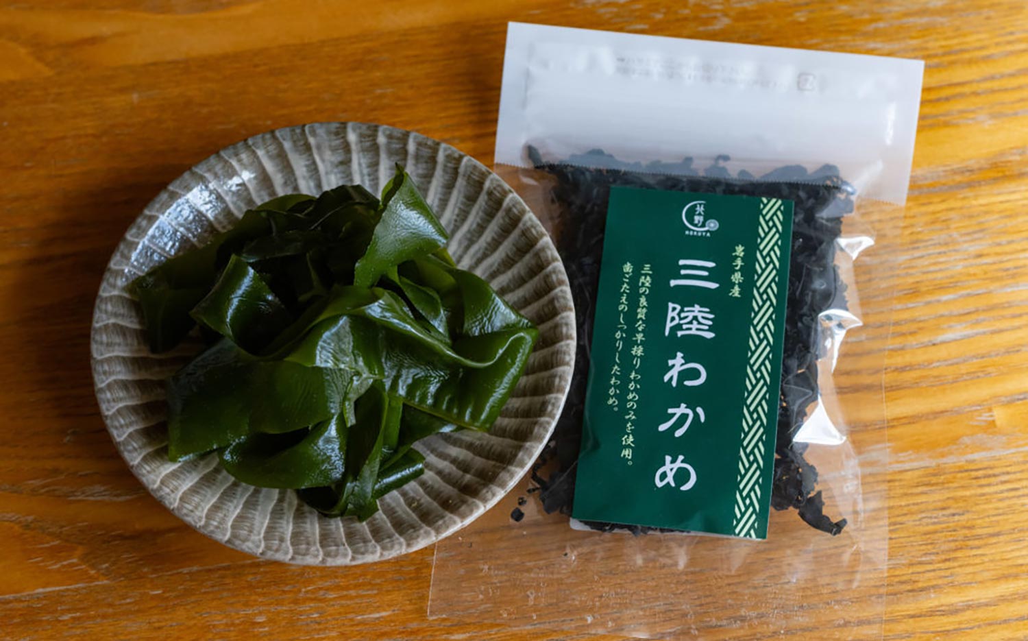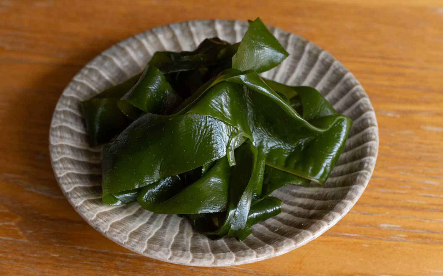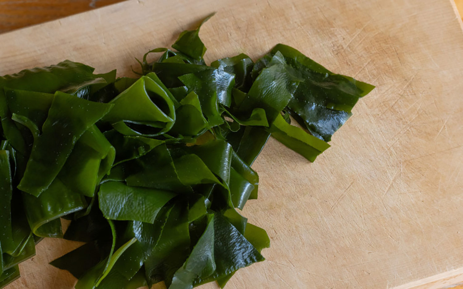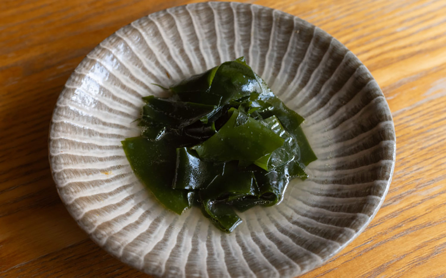 わかめの旬は春だが、塩蔵や乾燥などの加工を施して保存され、一年中味わえる。どれを用いてもかまわないが、今回は刺し身用のわかめ(湯通ししたもの)を用いた。