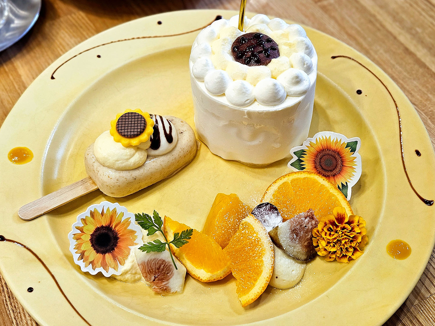 せっかくのひまわりプレートなので、黒猫は“季節のショートケーキ ひまわりデザイン”と、ひまわりチョコののった“キャラメルバナナムース”をチョイス。
