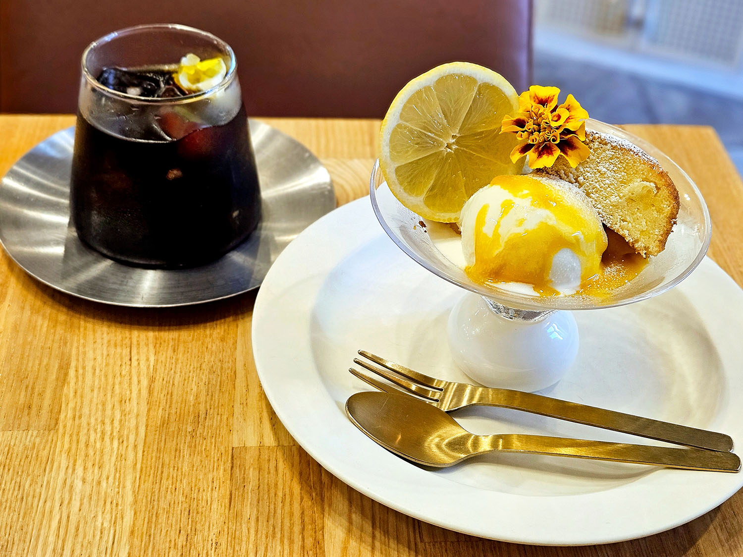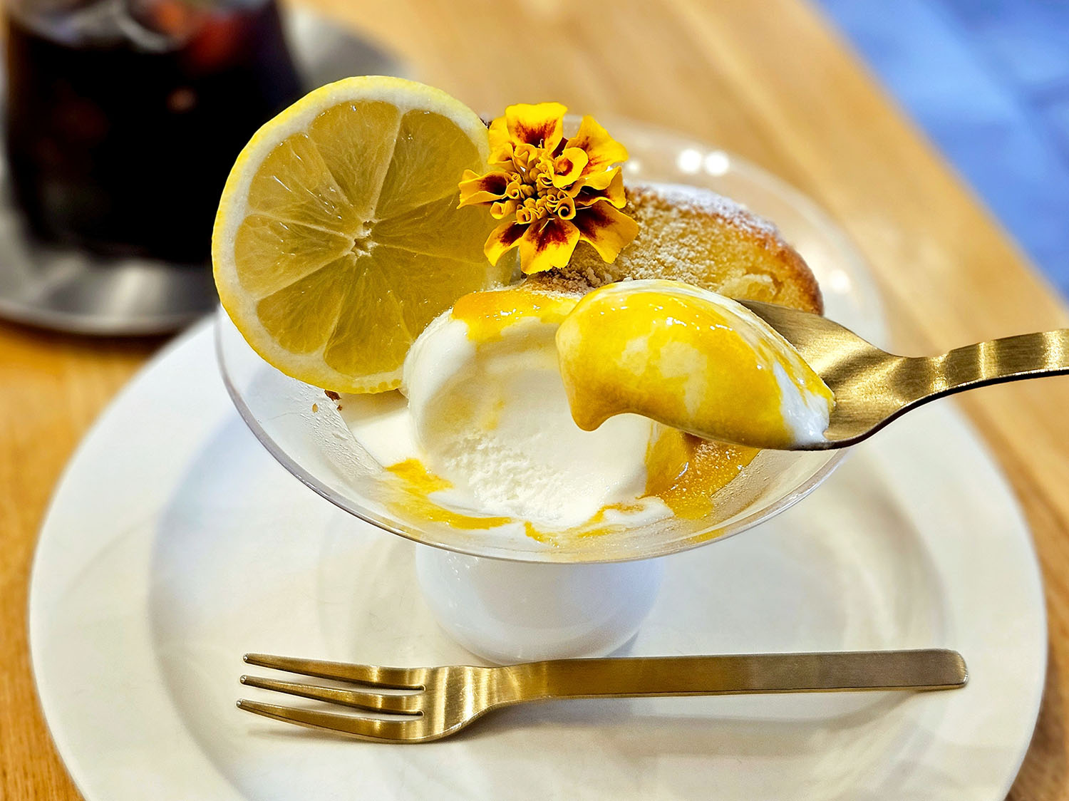 お店の焼き菓子の中でも人気のレモンケーキ、淡路島ミルクのアイスクリームと、自家製マンゴープリンの三位一体のパルフェ。