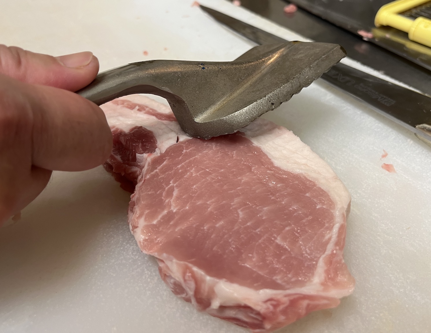 成形した上ロース肉は、赤身に触れず脂身しか叩かない。それは火の通りを良くするためだ。さらに脂身と赤身のキワに包丁を入れ、筋切りは最低限しかしない。