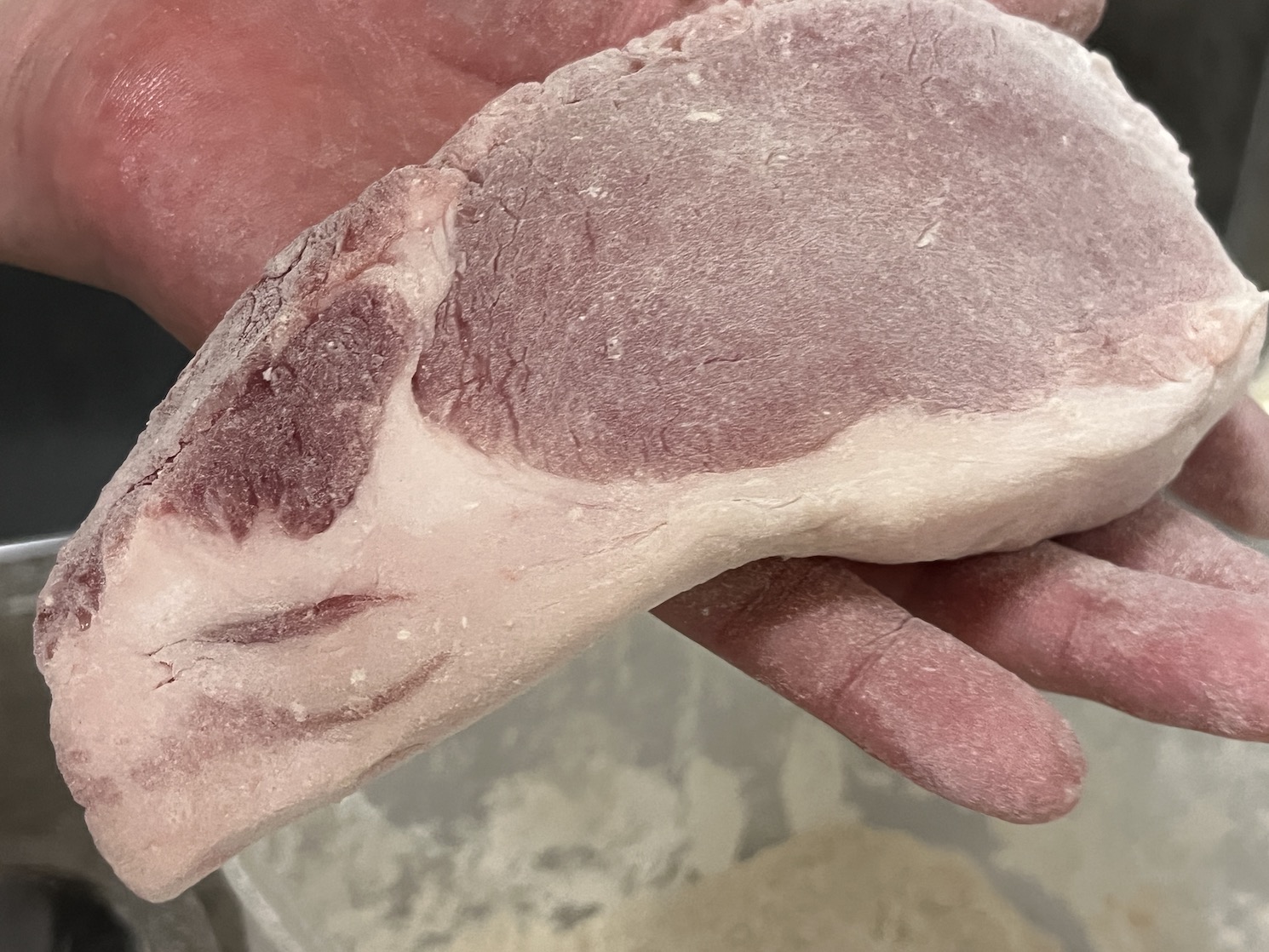 「肉には軽く塩をふるだけです。よくとんかつの下味にコショウをするけど、あれは肉独特の臭み消しなんです。この肉には臭みがないので必要がない」