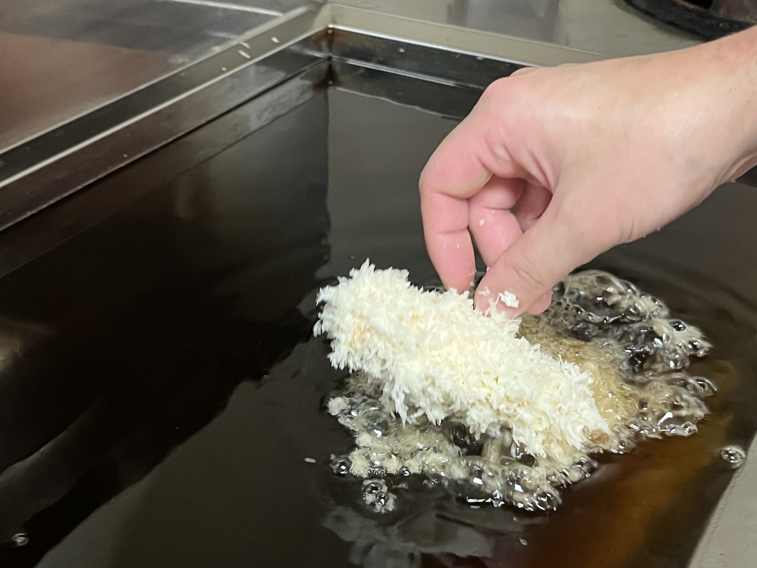 「揚げ加減は八分目くらいにとどめて、余熱で火を通します。油にとんかつを入れてブクブク泡が出てくると、その分水分が抜けていくのでなるべく早めにフライヤーからあげるんです」