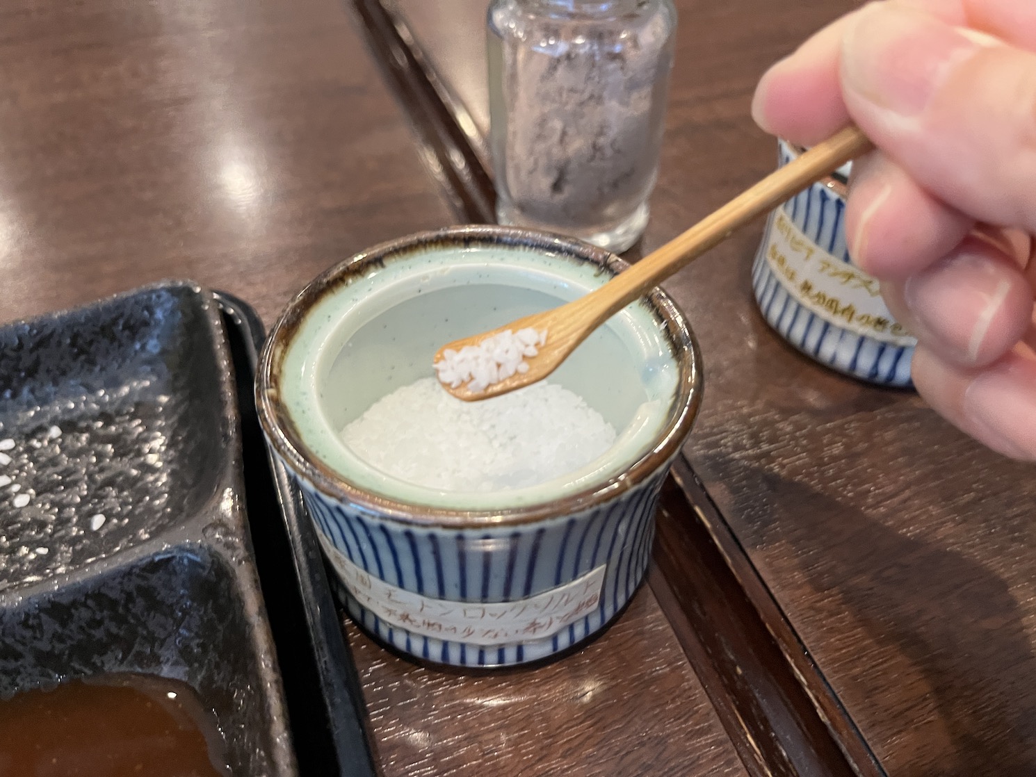 「とんかつは岩塩で食べると、脂の甘みがわかりますよ」と、店主がすすめてくれたのでまずはひと切れ、モートンロックソルトでいただきます。