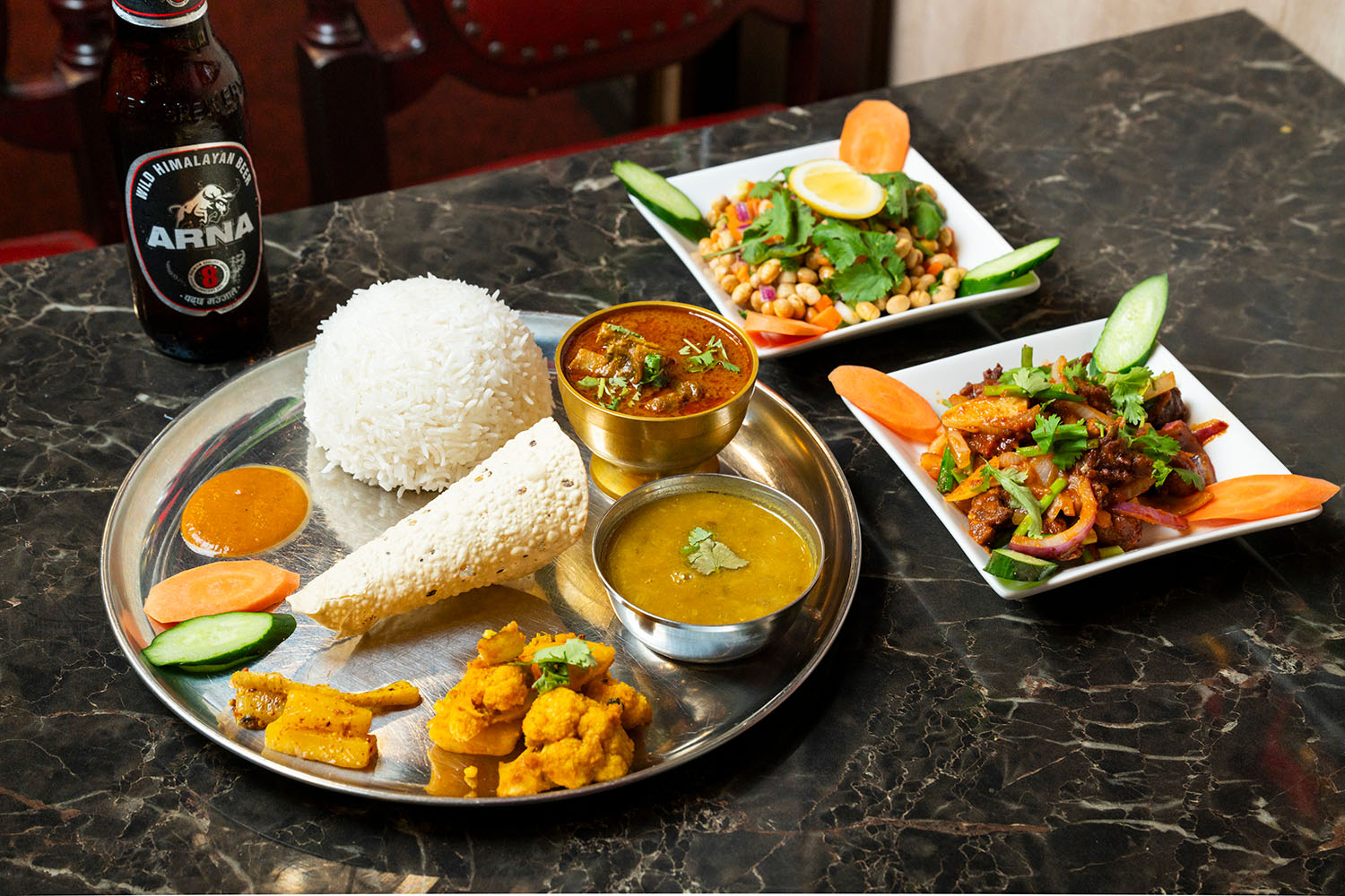 そしてネパール料理店に来たならば国民的定食であるダルバートをぜひ。ダル(豆の煮込み)とバート(米)をベースに、インドのものよりだいぶマイルドなスープカレー、タルカリという野菜メインの総菜、スパイス漬け物アチャール、豆の粉でつくったせんべい的なパパドなどがつく。いずれも優しい味わいで、インド料理よりもむしろ日本人にはなじみやすい。