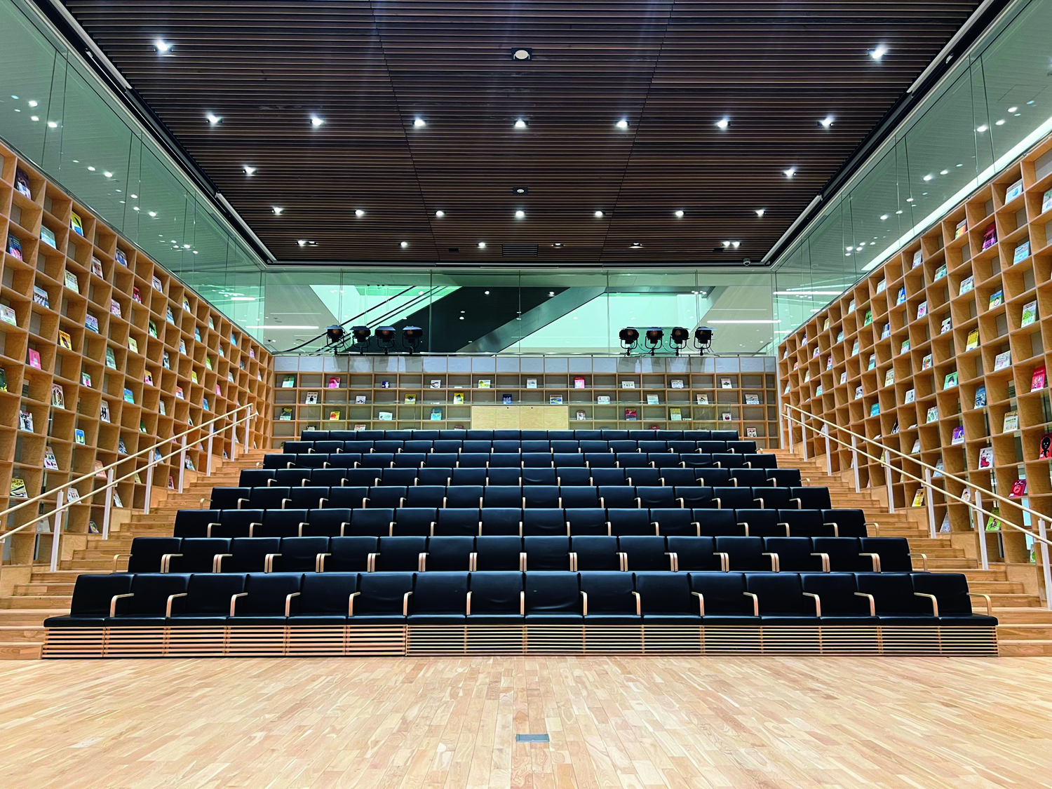 中央図書館、荒川区出身の小説家・吉村昭の記念文学館、ゆいの森子どもひろばが一体となった施設。壁一面の書架、読書ができるカフェやテラス席のほか、約128席の観覧席を備えたゆいの森ホールがひときわ目を引く。
