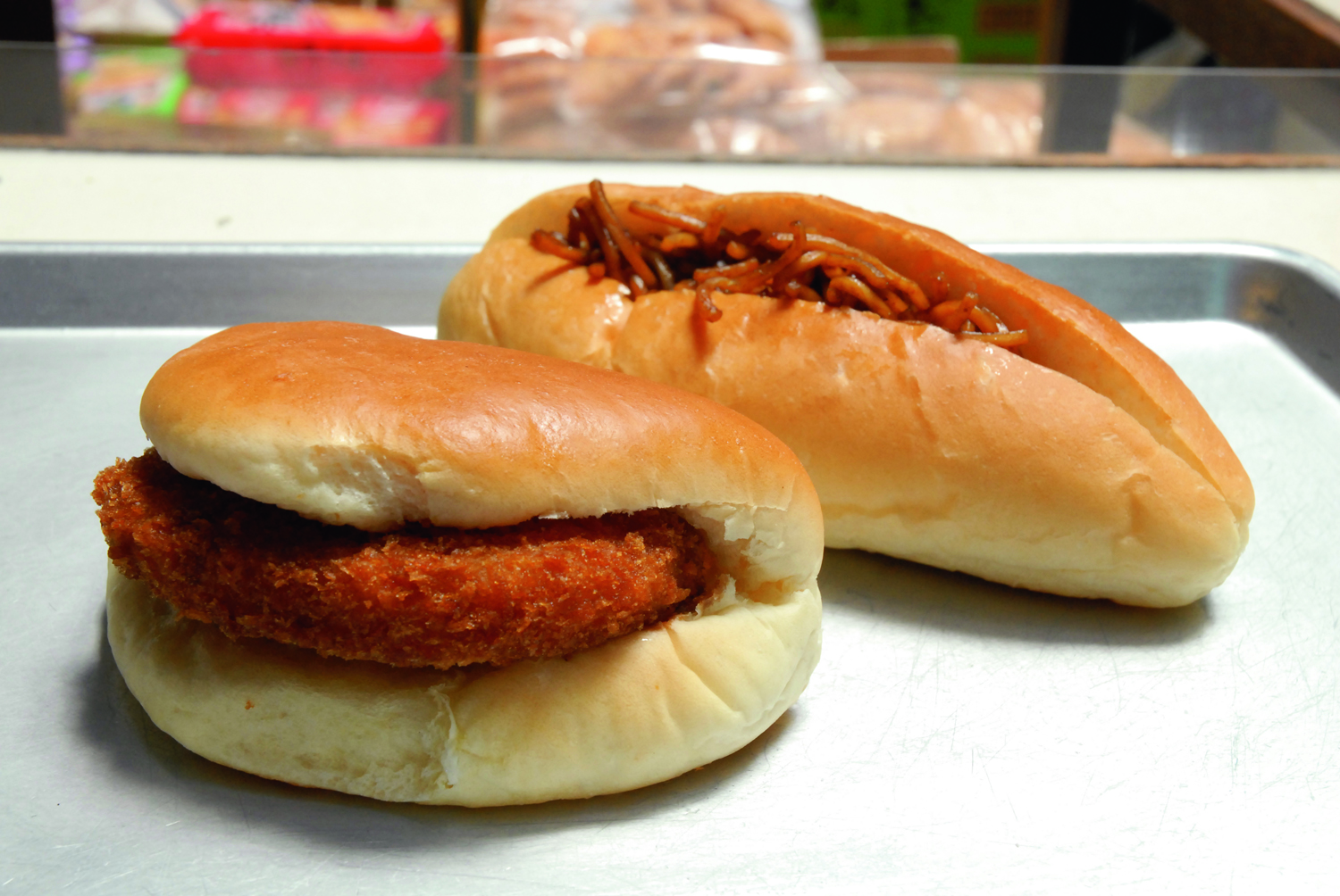ガラスケースの中に並ぶパンは、やきそば、コロッケ各150円、トンカツ180円などどこか懐かしい調理パンの数々。添加物なし、酒種天然酵母使用、米ぬか油で揚げたヘルシーパンだ。