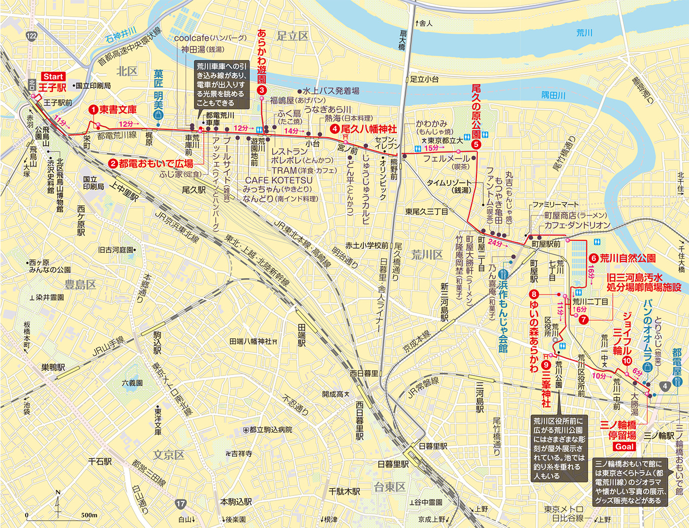 JR京浜東北線・地下鉄南北線王子駅→(11分/0.7㎞)→東書文庫→(12分/0.8㎞)→都電おもいで広場→(12分/0.8㎞)→あらかわ遊園→(14分/0.9㎞)→尾久八幡神社→(15分/1.0㎞)→尾久の原公園→(24分/1.6㎞)→荒川自然公園→(16分/1.1㎞)→旧三河島汚水処分場喞筒場施設→(6分/0.4㎞)→ゆいの森あらかわ→(11分/0.7㎞)→三峯神社→(10分/0.6㎞)→ジョイフル三の輪→(6分/0.4㎞)→都電荒川線三ノ輪橋停留場