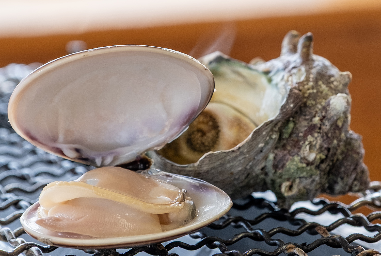 店内から太平洋を見通せる磯料理自慢の店。とりわけ九十九里浜で採れたハマグリは身が柔らかく、甘みも濃厚だ。海鮮網焼きセットのほか、いわし御膳1400円やあじフライ定食1300円、あじのなめろう単品900円なども人気がある。焼きハマグリのみの注文も可(時価)。