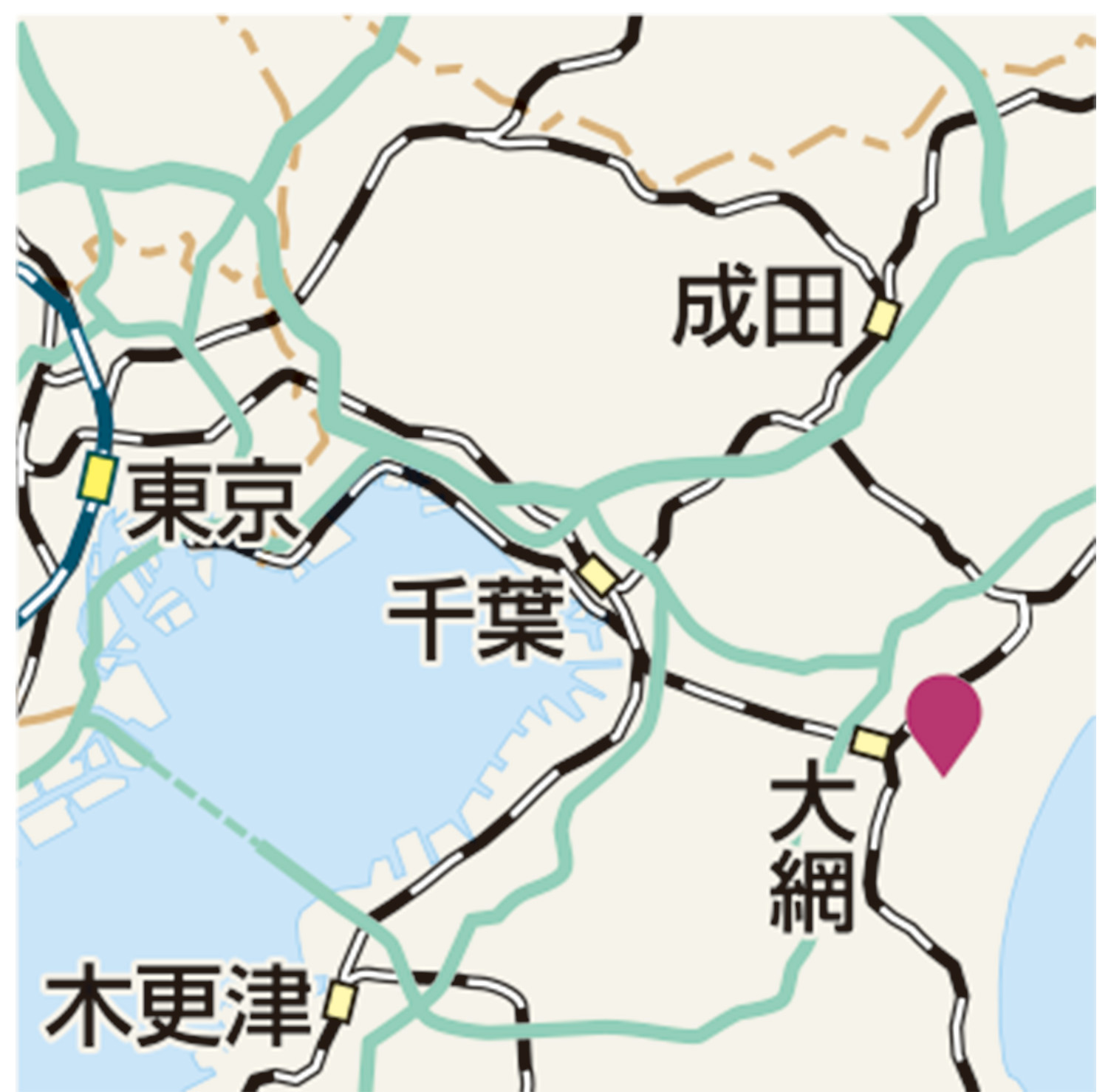 車:宮城野JCTから京葉道路・千葉東金道路・圏央道を利用し、大網白里SICまで約32km。同SICから市中心部まで約3km。