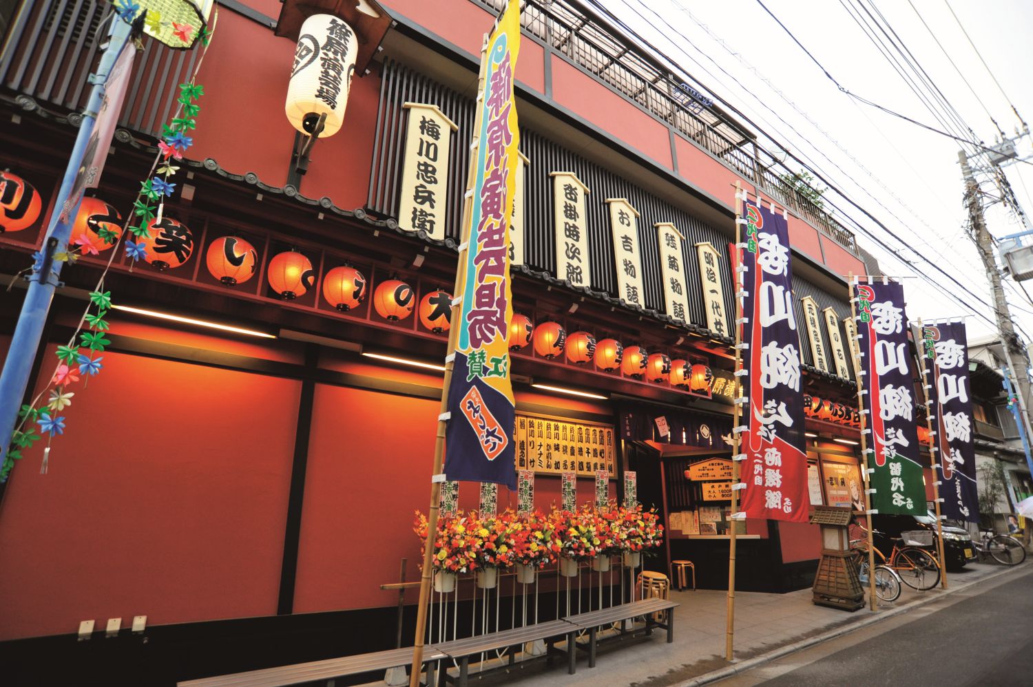 公演する劇団が毎月入れ替わる大衆演劇の常設劇場。床に直接座布団などを敷いて座るため、客席と舞台の一体感がすごい。演目が毎日変わるので、連日来ても違う演目を観られる。