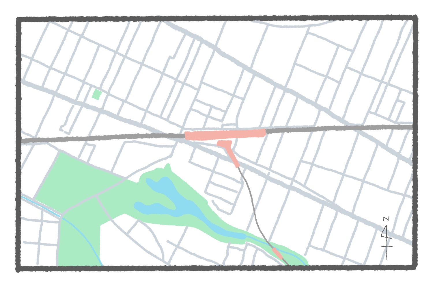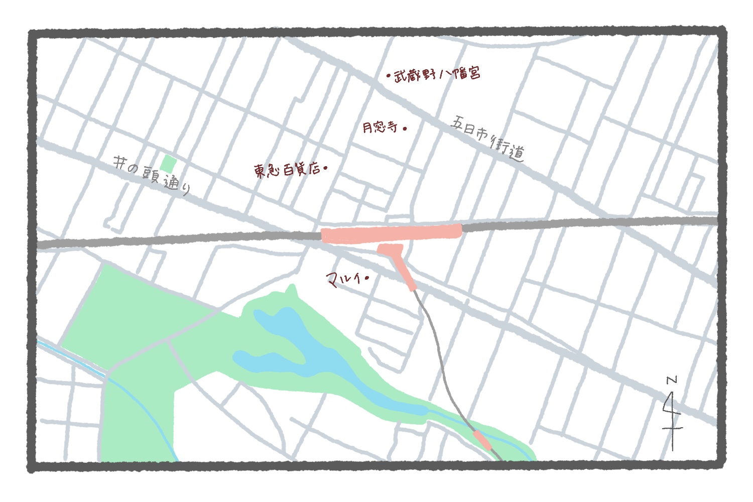 もはや“住みたい街”の代名詞になりつつある吉祥寺。住みたくなる理由の大部分が井の頭恩賜公園にある! というのは筆者の個人的な意見だが、少なくとも地図クイズにおける一番のヒントもやはり井の頭恩賜公園だ。大きな公園が近くにある中央線の駅といえば信濃町駅や立川駅などがあるが、これほど駅のそばに公園が位置するのは吉祥寺駅のみ。公園内の井の頭池は神田川の源流であり、ここに描かれた水流は東へと流れ御茶ノ水駅をかすめて隅田川に合流する。公園でピンと来ないとなると、逆にそれ以外の要素で答えを導き出すのは難しかったかもしれない。