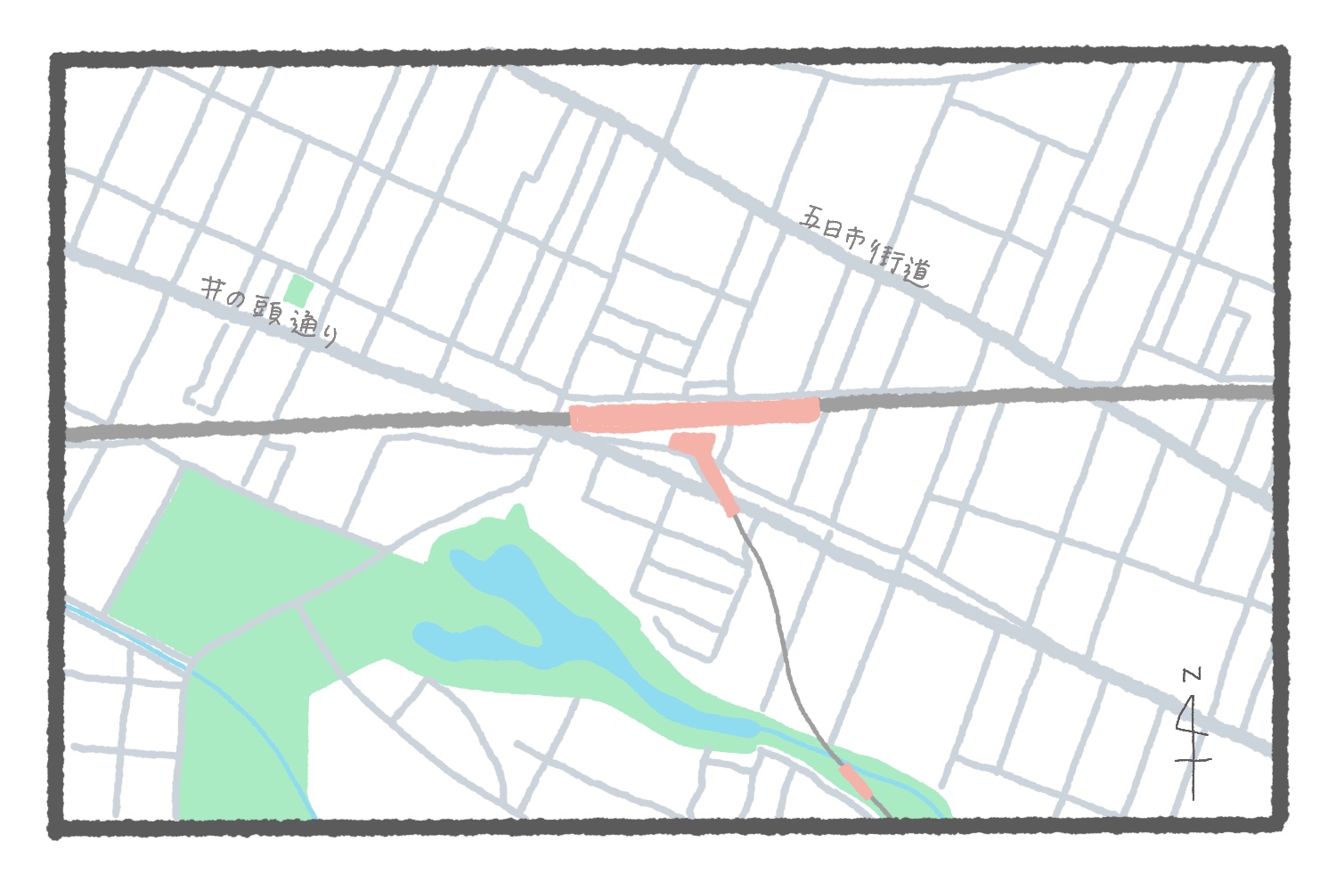 なおこの近辺には、神明通り、井の頭通り、御殿山通りなど五日市街道と並行して走る道がいくつもあるので、同様の角度で道と線路が交差する地点が多い。道の角度だけである程度のエリアを当てられるようになれば、地図クイズ達人の領域かも……。