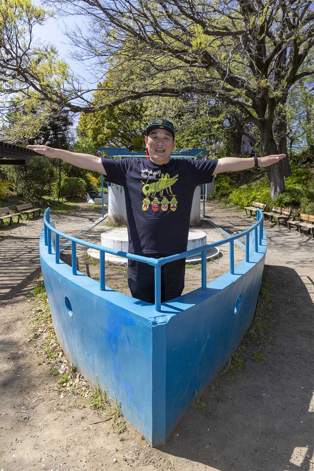 で、大型船のコンクリ遊具のお出ましだ。仕方がないから俺も今からやるけどさ、ここでこうやってタイタニックごっこやった人、今年だけでもすでに100人は超えていると思う(笑)。延べ人数で行ったら万単位になってると思うな。