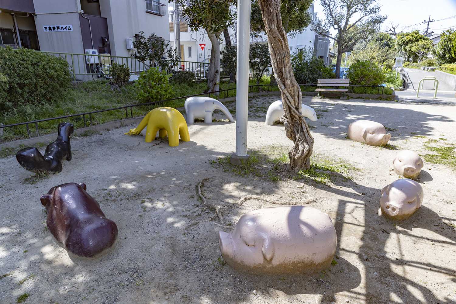 うわ見てよ! イノシシは初めて見たわ。イノシシって他であんま見かけなくない? なるほどこういう昭和のコンクリ遊具がまだまだ残ってる公園なんだな。