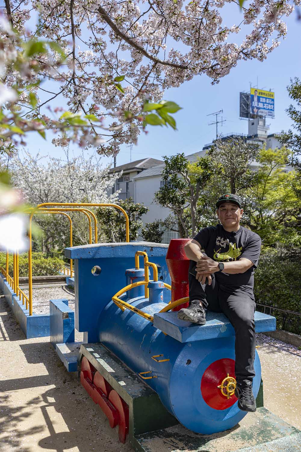 けっこうデカいな。最近の遊具と違って、コンクリートのヤツは大人が乗っても良い感じがするからありがたいよね。この機関車ってさ、ほかで作って持ってこれないじゃんね? 俺はここで枠を組み立てて、その中にコンクリートを流し込んで作ったんじゃないかと踏んでるだけど、どう思う?
