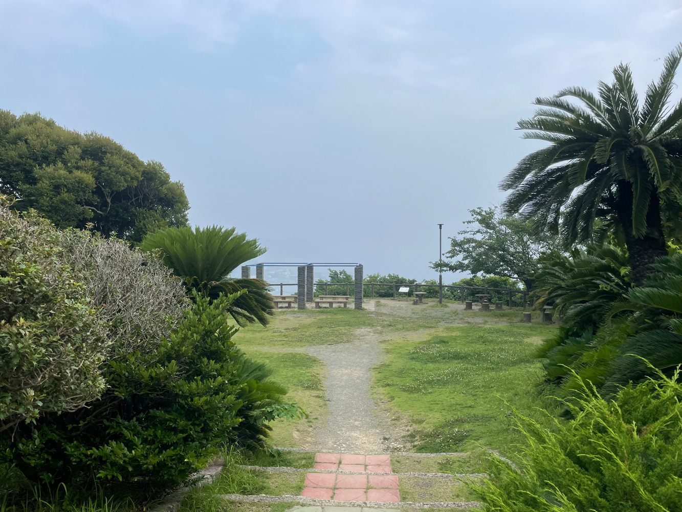 休憩スペースにあるベンチに座って海側の風景を眺めるが、曇っていたためそれほど遠くまで見渡すことができなかった。うっすらと見えたのは方向的に葉山港だろうか。