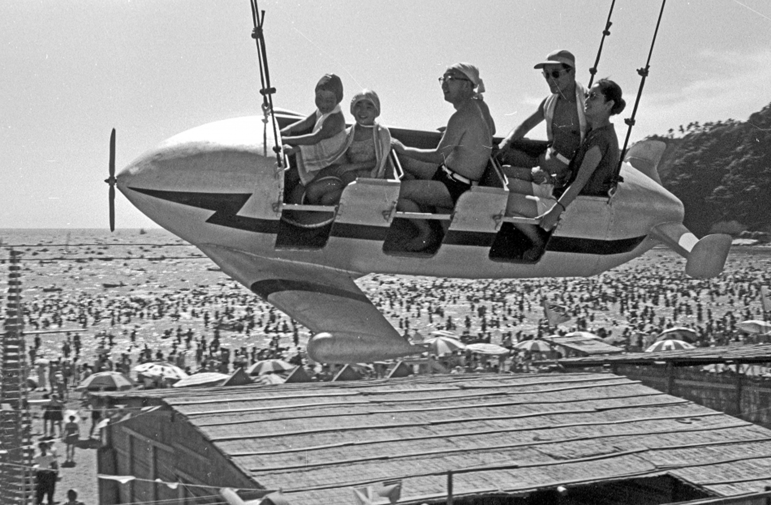 「逗子フォト」に掲載されている写真には「宙返りロケット」なる回転系の乗り物が写っていて、家族連れが水着姿のまま乗っている。おそらく上記の「吊るされた飛行機で鉄塔の周りをクルクルと回る」乗り物がこれだろう。それほど鮮明ではない白黒写真だが、こちらを向いている子供は笑顔で、楽しそうだ。石原良純氏の文章からも当時の逗子海岸のにぎわいが伝わってくる。
