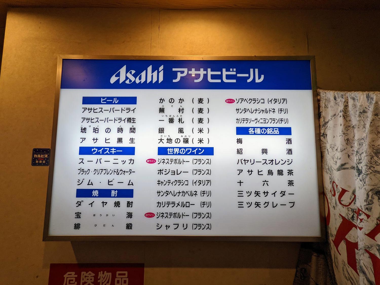 暖簾をくぐるとアサヒの電気看板がお迎え。本体がある2階へ続く階段が、ワクワクさせるじゃないか。