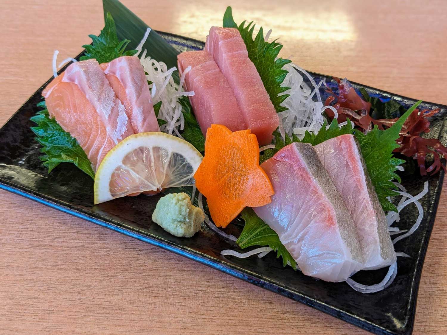 まずやってきたのが「刺身三点盛り」。ハマチ、本マグロ、サーモンの脂がみなぎるフルコース。分厚めカットのハマチはバターのような舌ざわりで、決して水っぽくなく良質な旨味。