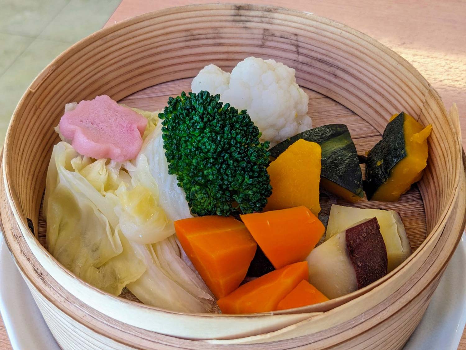 思わず「うわぁ!」と声を上げた「せいろ蒸し 季節のお野菜6種」が到着。色褪せたせいろにカリフラワー、ブロッコリー、キャベツ、ニンジン、サツマイモ、カボチャ、桜型のかまぼこのグラデーションが美しい。訪問時は桜の時季が終わったくらいで外の桜は散っていたものの、こちらでは満開の花が咲いているようだ。