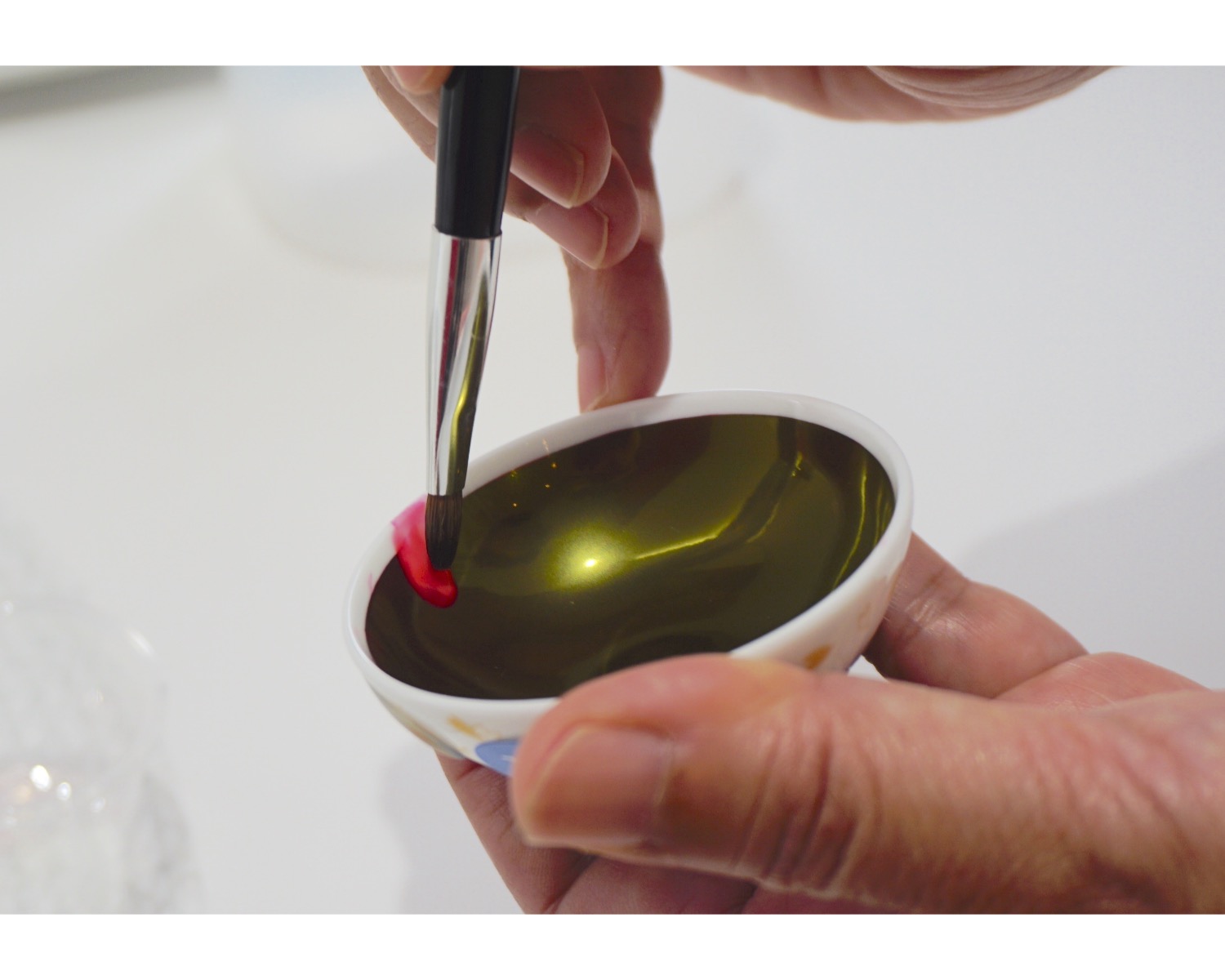 こちらが、伊勢半で作り続けられている「小町紅」です。優れた品質の紅は、このように玉虫色に光り、水で溶くと一瞬で鮮やかな赤色に発色します。この不思議な輝きの原理は、現代の科学でも解明しきれないのだとか。江戸時代には紅を厚く塗ってこのように玉虫色に光らせる「笹紅」という塗り方が流行ったのだそうです。