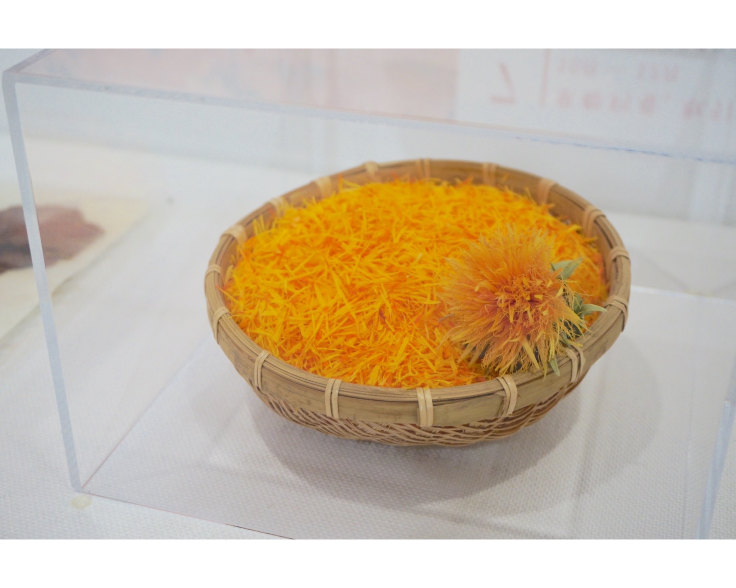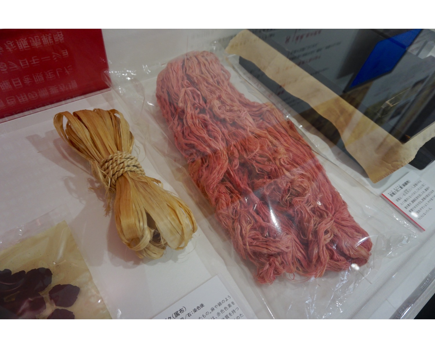 この紅餅を水に浸け、アルカリ水溶液を加えると、花びらの中から色素が溶け出します。この液体に麻の繊維をつけると、水溶液の中の赤い色素がセルロースに吸着され、黄色い色素は水の中に残るので、赤い色素が抽出できるのだそうです。