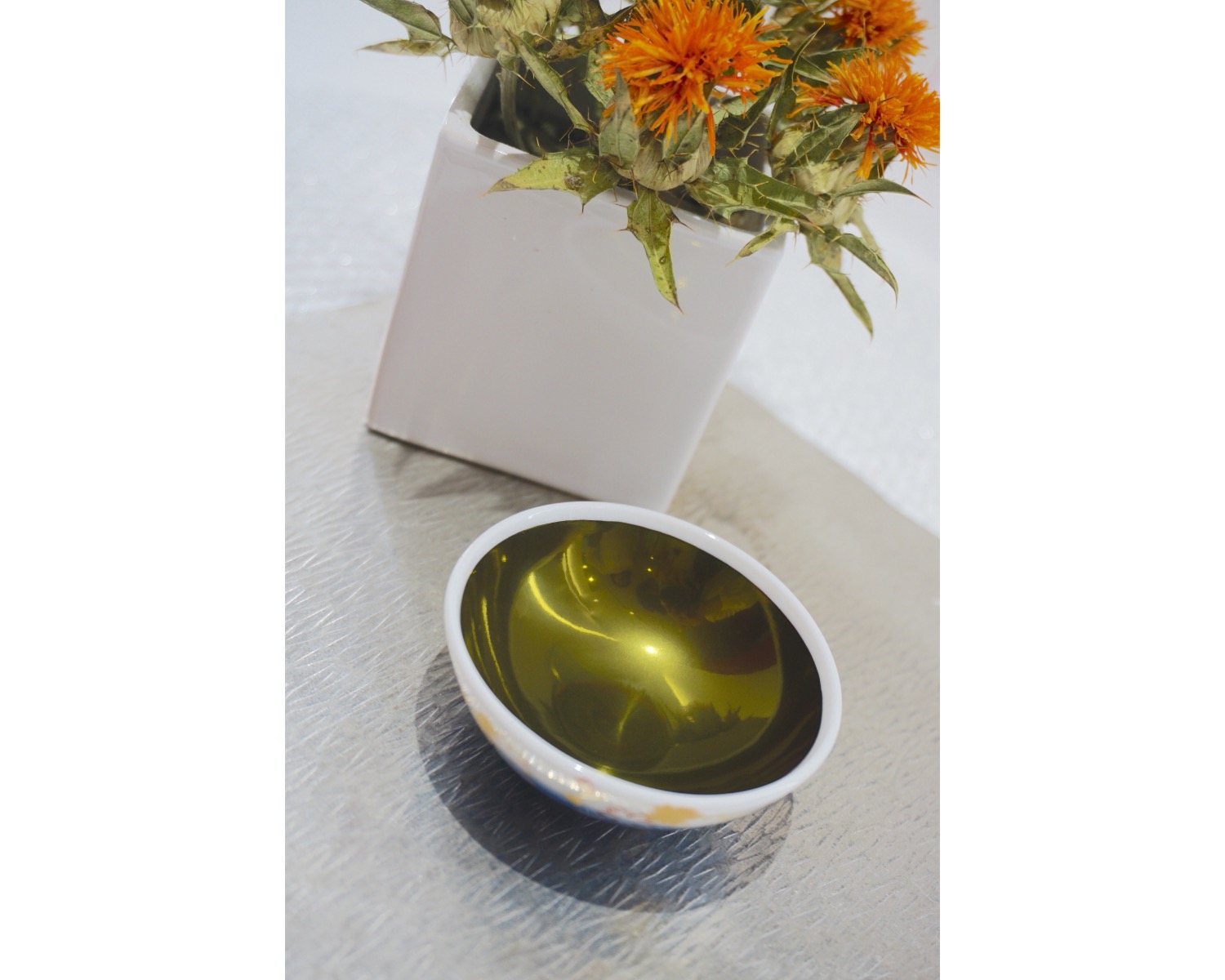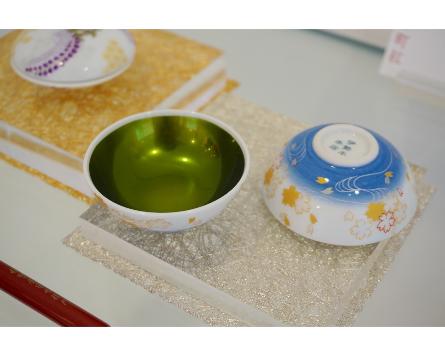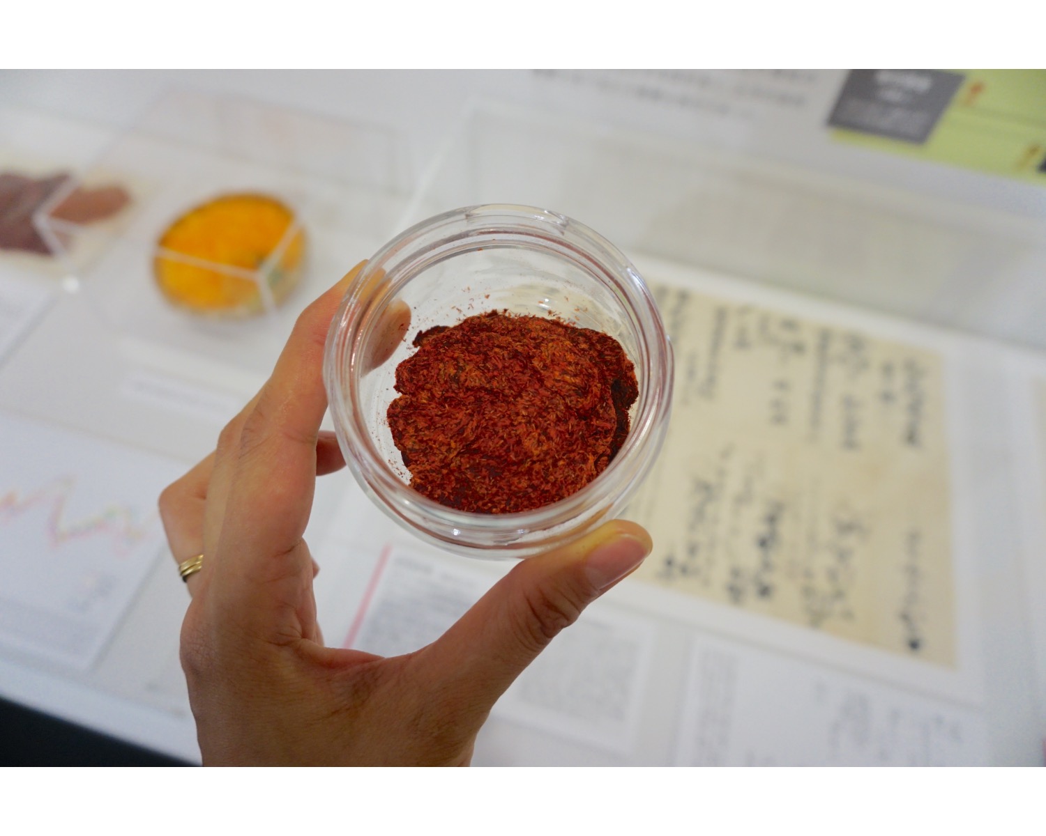 ちなみに、こんなふうに美しい玉虫色になるのは、極めて純度の高い紅だけなのだとか。紅花以外の色素を混ぜて作られる紅や、エンジムシから採取した染料を綿に染み込ませた生燕脂(しょうえんじ)などもあったそう。