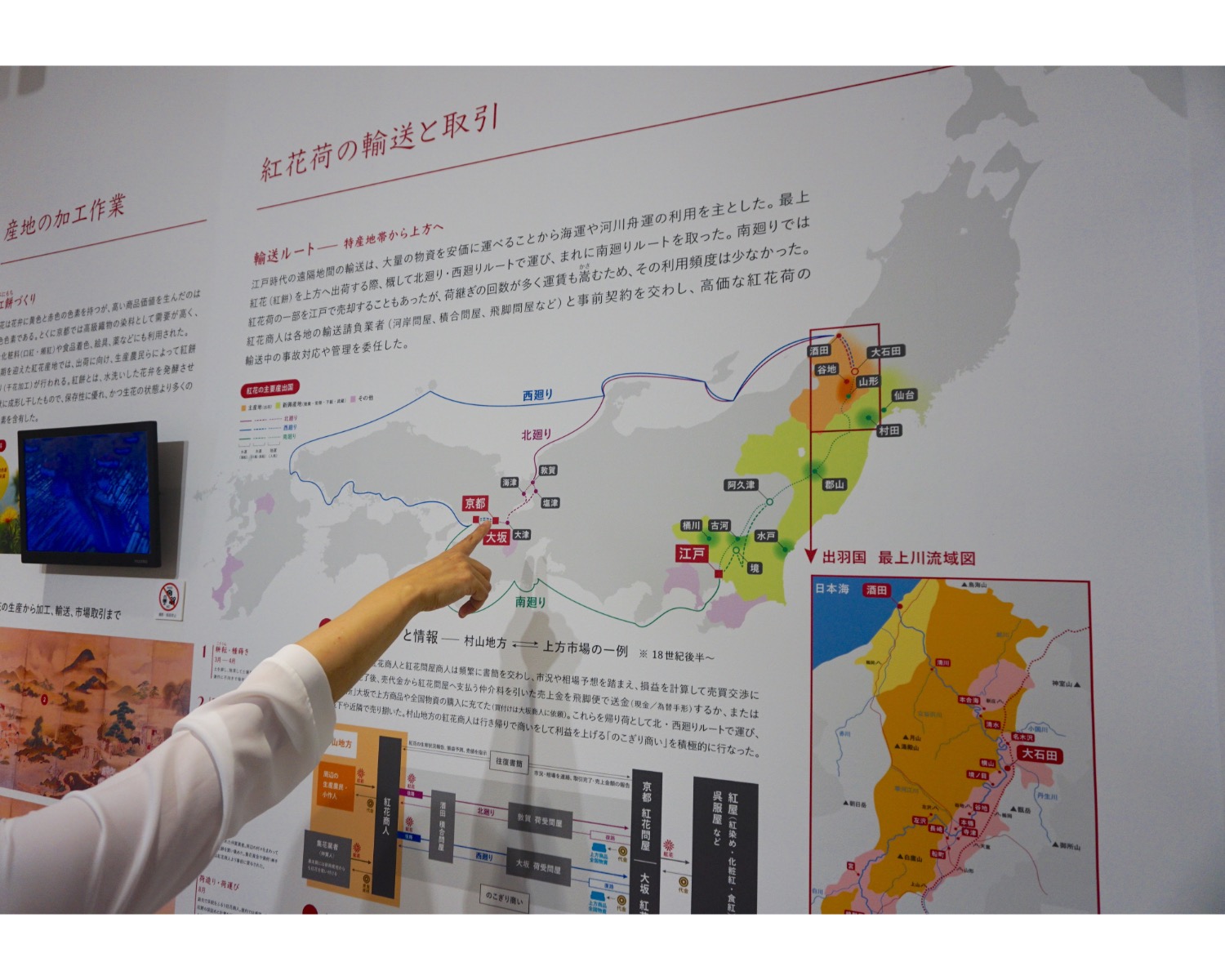 紅餅は最上川を通じて酒田の港へ。そこから昆布などを運び“動くデパート”とも呼ばれていた北前船で運ばれました。その後、琵琶湖の舟に揺られて京都や大坂へと向かったのだそうです。