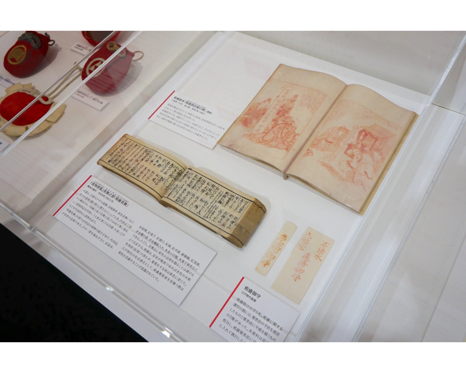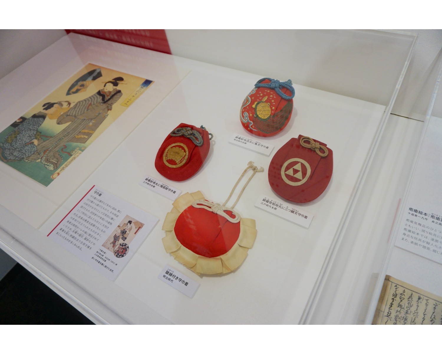 紅は化粧や絵画のほか、布を染める染料としても使われていたのだそう。また、お祝いや魔除けの色として用いられていた例も興味深いです。こちらは、護符などを入れて子供に身につけさせたという「守巾着(まもりきんちゃく)」。他にも、紅染めの産湯布で赤ちゃんをくるんであげると、魔物の目から赤ちゃんを隠すことができるという考えもあったのだとか。
