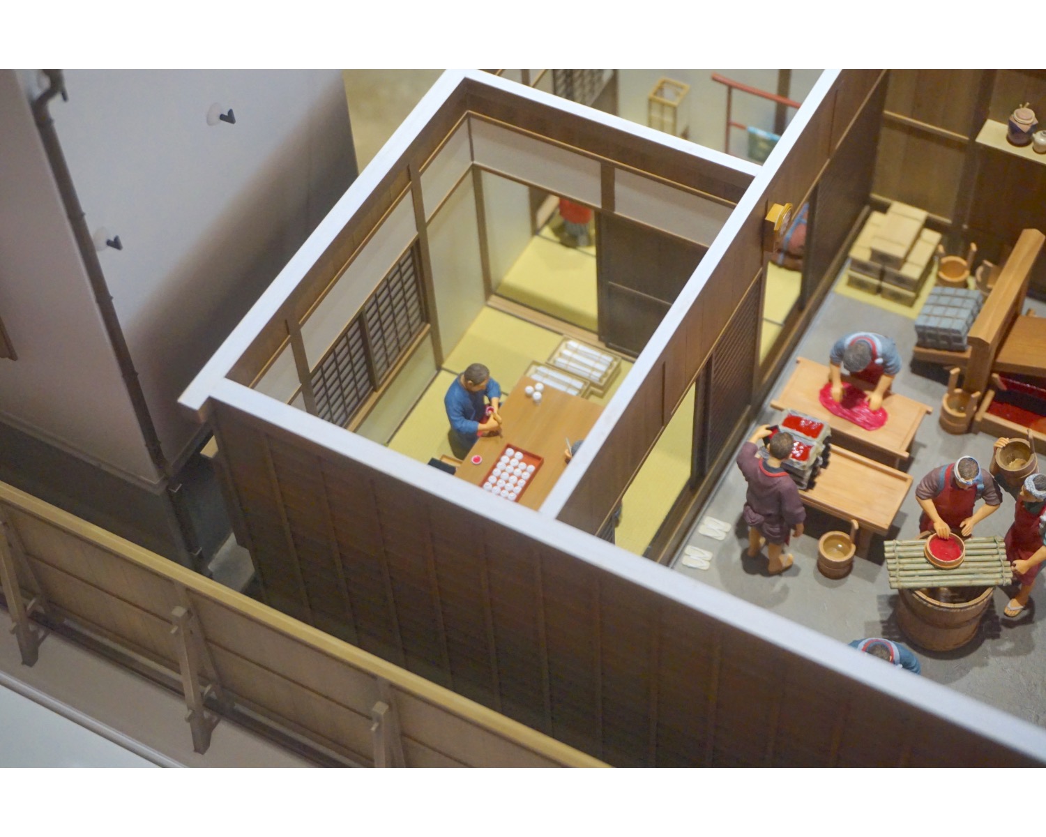 こちらは明治時代の伊勢半の店頭風景のジオラマ。江戸時代には、紅を買う人が紅猪口を持って紅屋に行くと、このように職人が紅を筆で刷き直してくれたのだそうです。