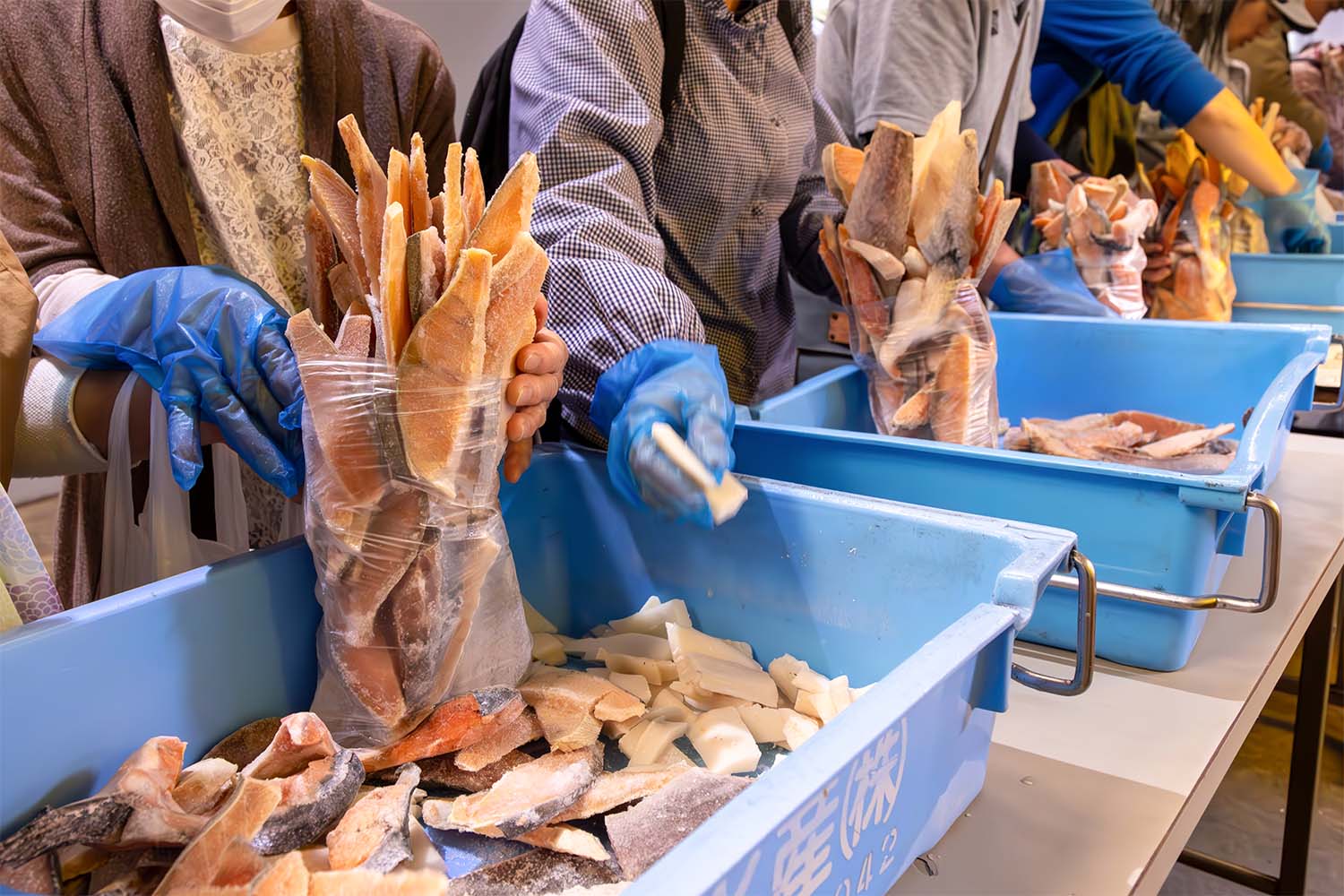 そして詰め放題に挑めば、シャケ、タチウオ、カマスなど、小袋からあふれるほど積み上げる猛者たちの執念に圧倒されるばかり。家計応援サービスは瞬く間に打ちドメ必至で、早めに来て正解。