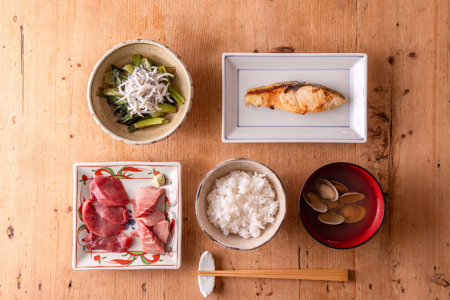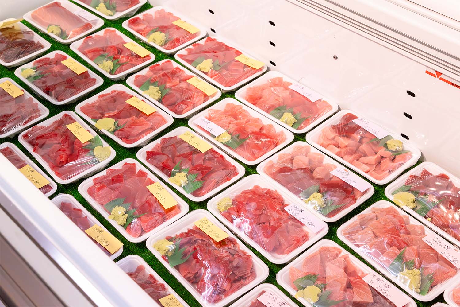 鮮魚・魚介の『池田水産』では地場の甘塩シラスがふっくら、アサリやハマグリはぷっくり大粒だし、朝市だけ小売りする『鮪のまつだ』では生本マグロの色艶にうっとり。