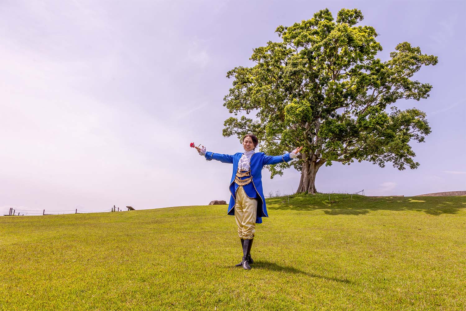 ということで、執務室「太平洋不動産」を訪ねると、仕立てのいい海色のジャケット、ゴールドパンツを優雅に着こなし、一輪のバラを携えた、紛れもないプリンスが出迎えた。