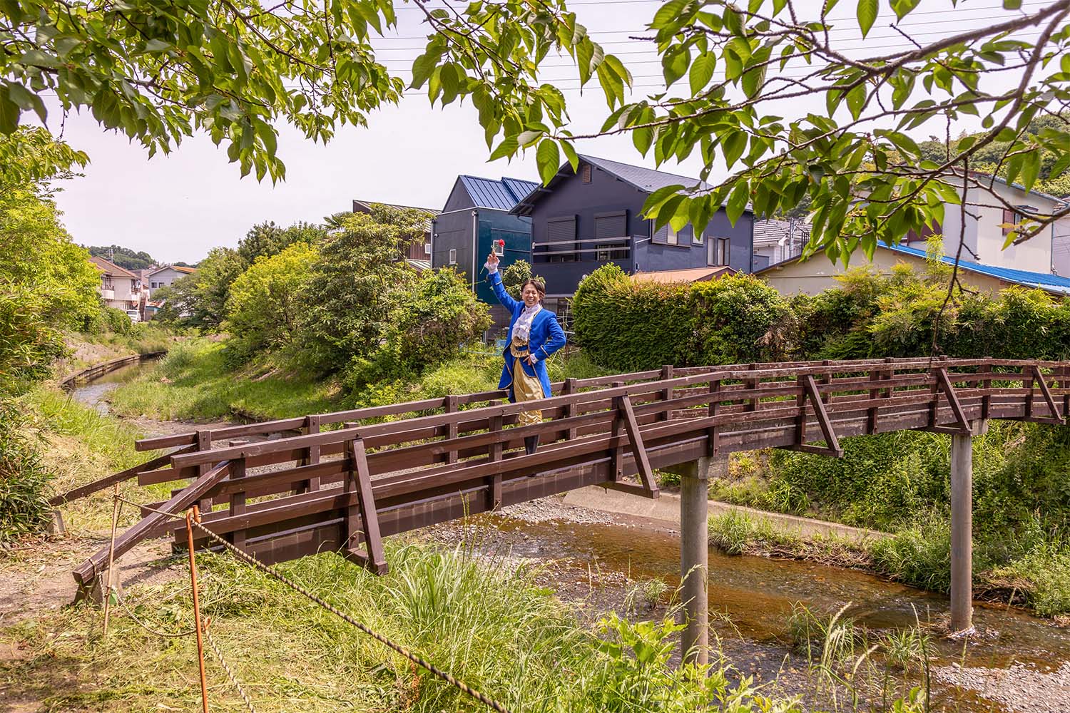 路地の先で、人一人が通れるほどの幅しかない木造の橋に冒険心がくすぐられる。橋下を流れる清流は、地元民の活動の賜物で、コイが泳ぎ、サギが舞う。橋の真ん中で川向こうを見れば、富士山もひょっこり顔を出す。