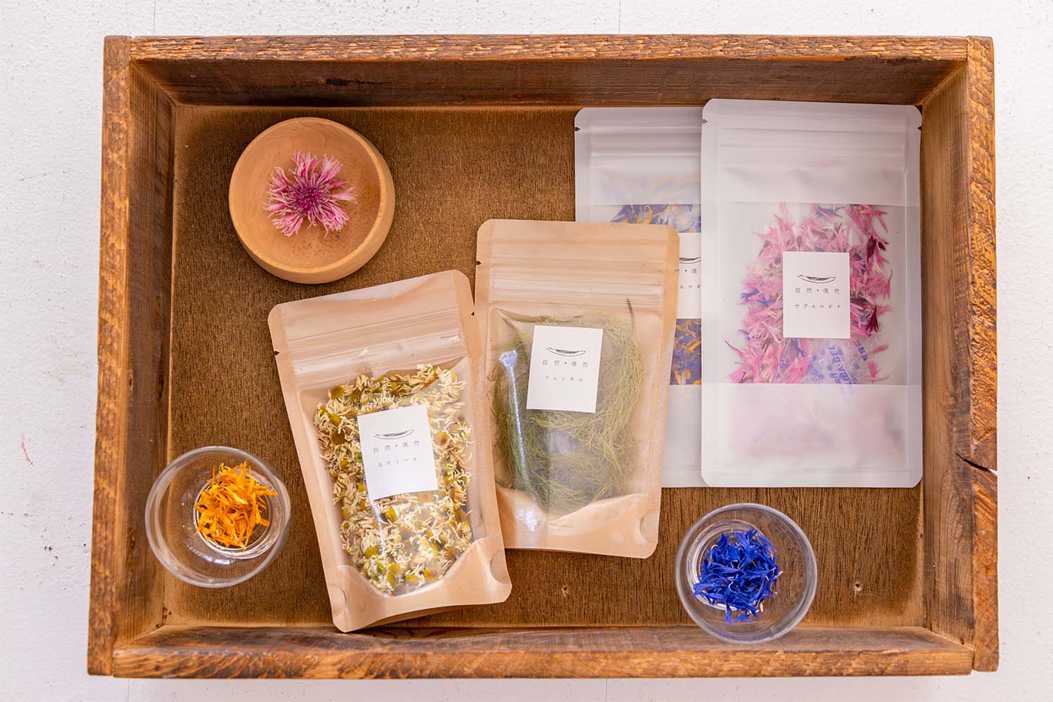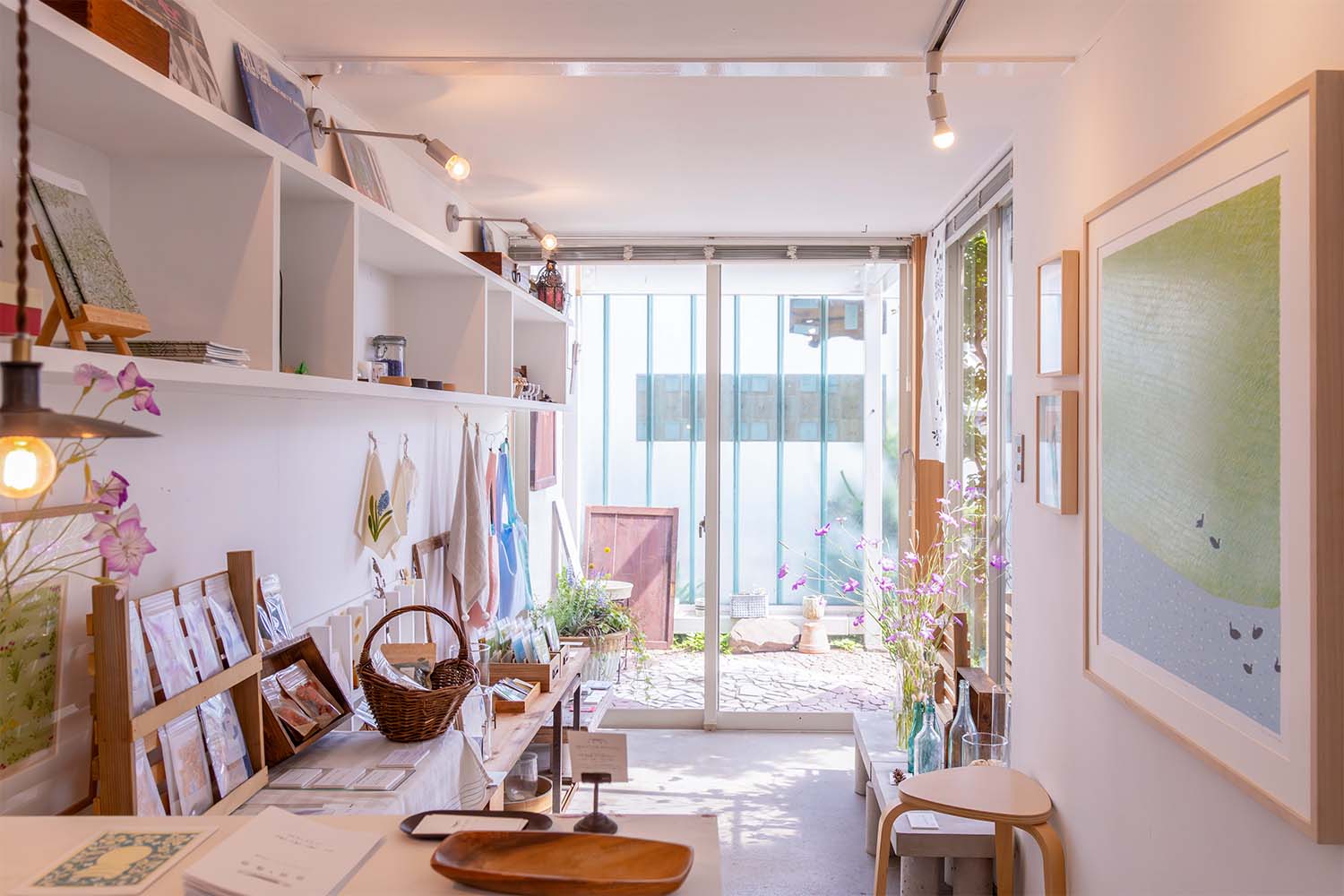 移住を機に店主の二井矢優太さんは花とハーブの自家栽培を始めた。ヤグルマギク830円〜を散らせば皿が華やかになり、フェンネル330円〜やカモミール550円〜のハーブティーに心が和む。また、妻の春菜さんはシルクスクリーン作家でワークショップも不定期開催。風を感じる植物柄の雑貨が素敵だ。