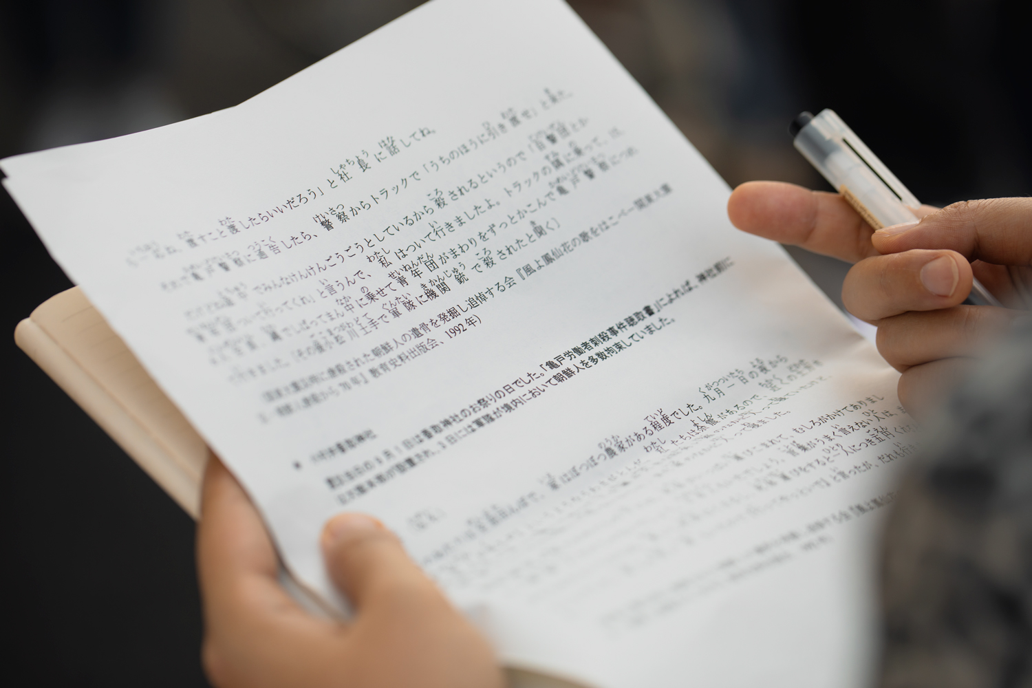 震災から102年が経ち、体験した人がほとんどいなくなった中、20〜40代のメンバーからなる「百年(ペンニョン)」というグループが虐殺事件について記憶し、考えるための活動を行っている。その一環となる今回のフィールドワークは、聞き取り調査や文献から集めた証言の現場を訪ね、その場で音読するというものだ。