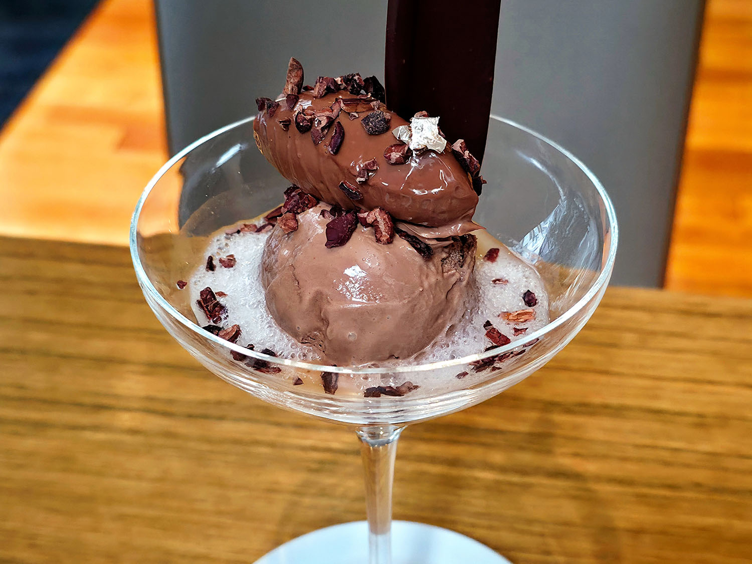 まず、チョコアイスとチョコクリームをひと口味わってから、グラスに広がる“ライチの泡”と“カカオパルプソース”と絡めて味わうと、あと味が爽やかに。