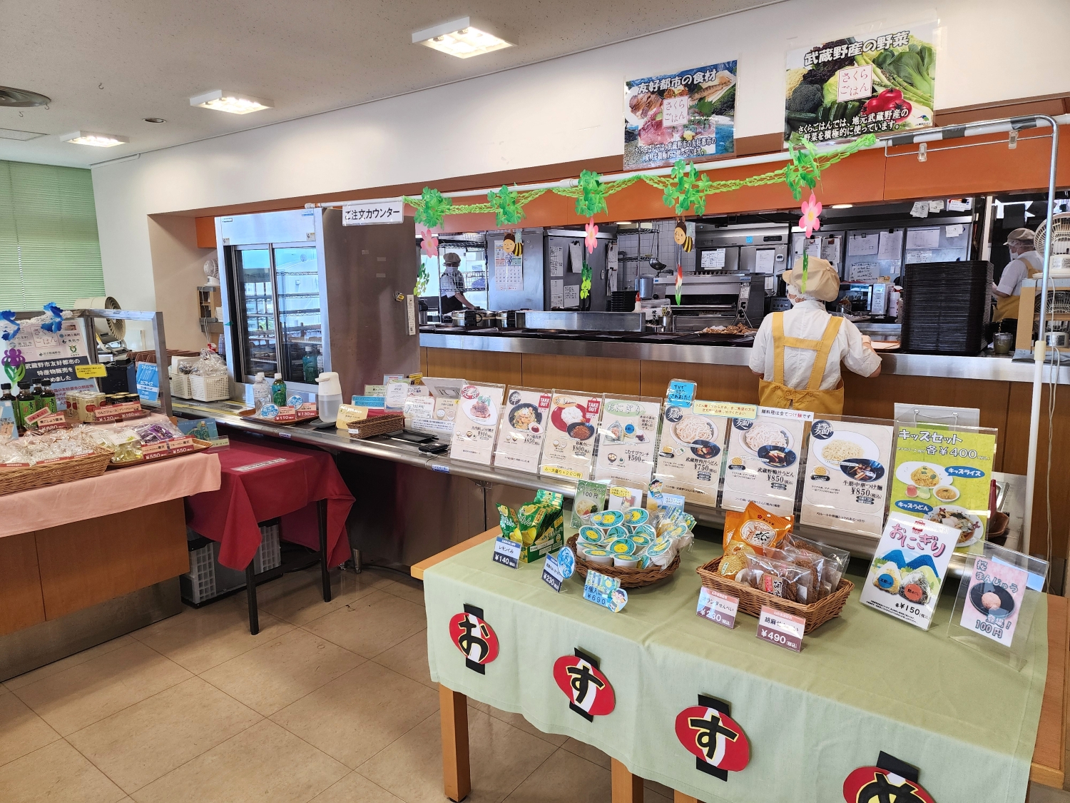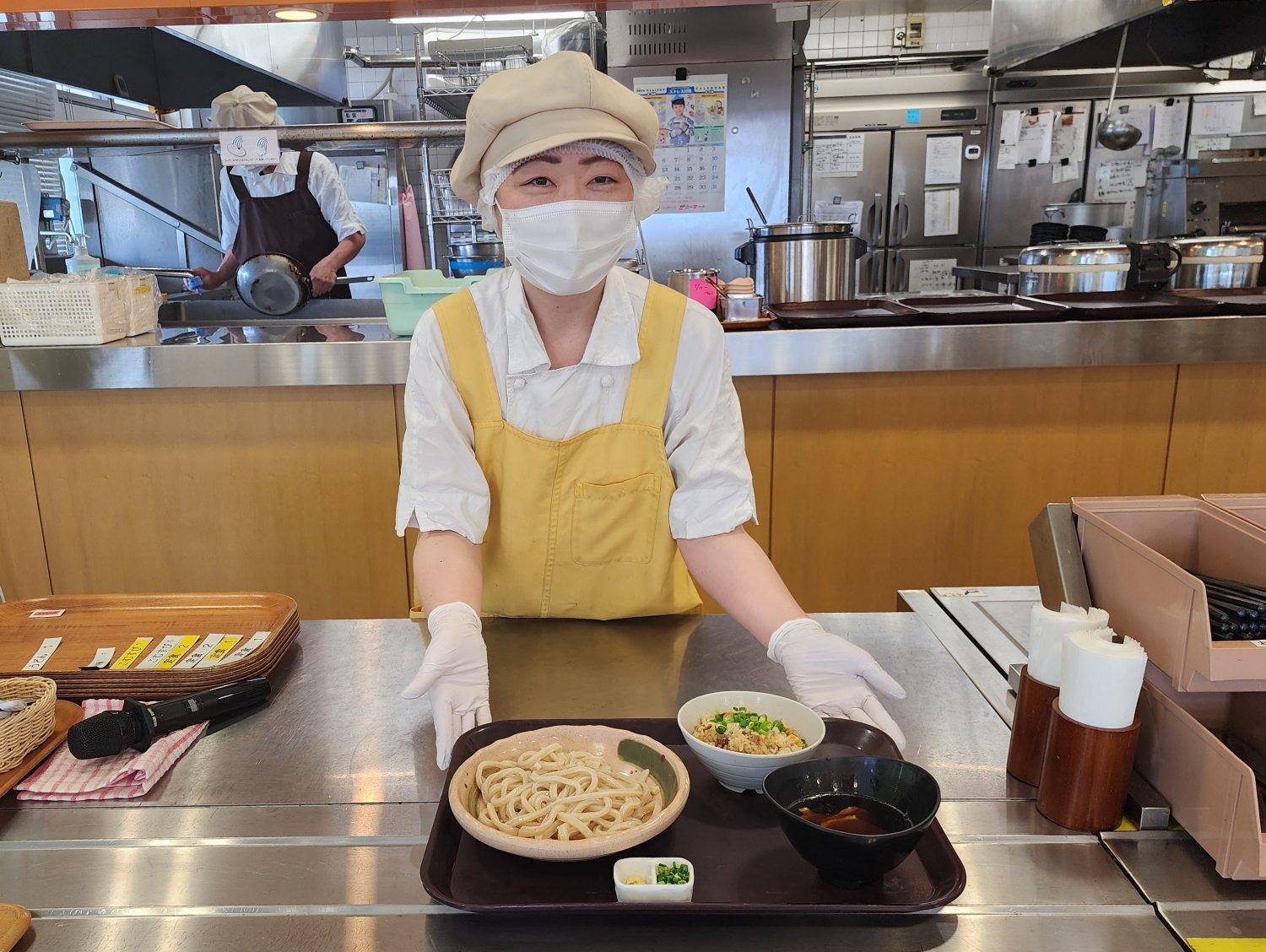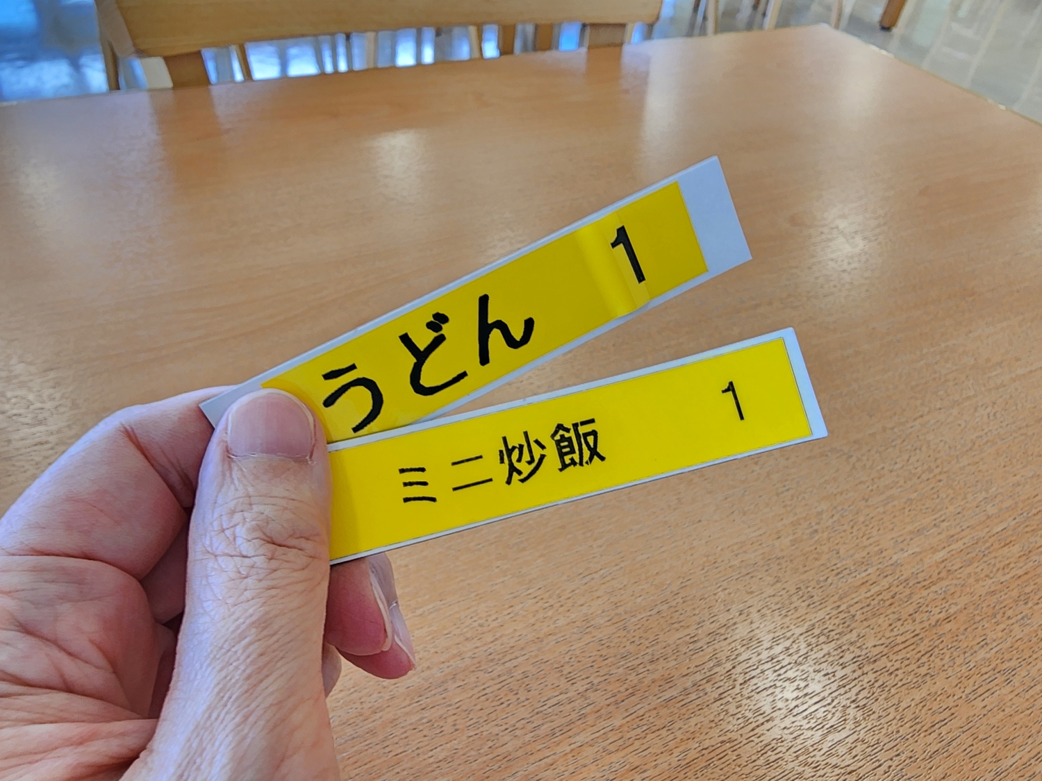 席に座ってぼんやり外の景色を眺めていると、「うどん1、ミニチャーハン付きでお待ちのお客さまー、受取カウンターまでお越しくださーい」とマイクを通してやさしい声が響く。
